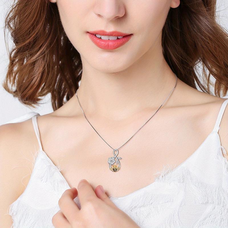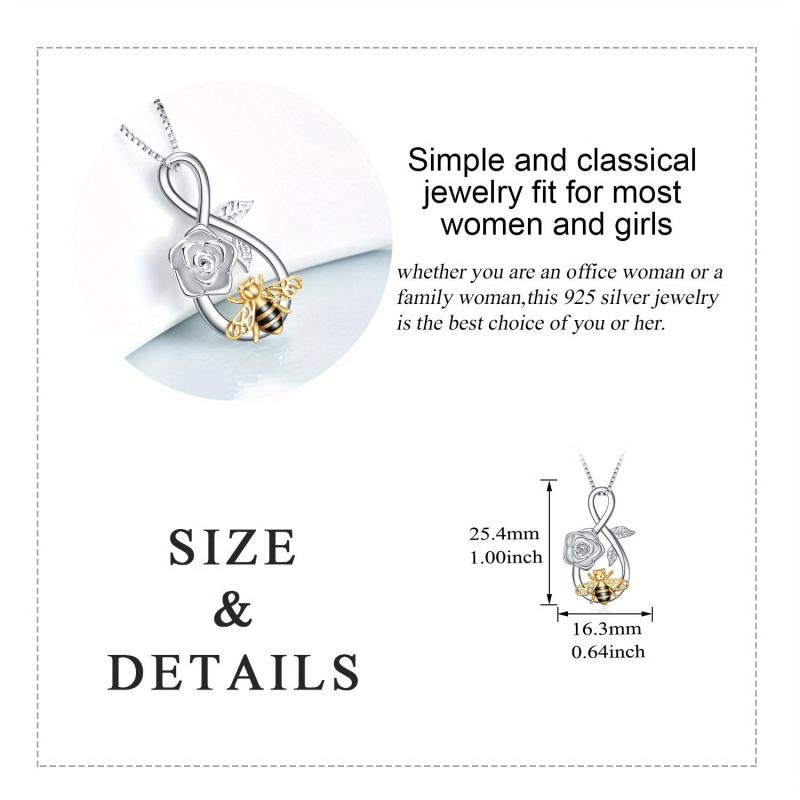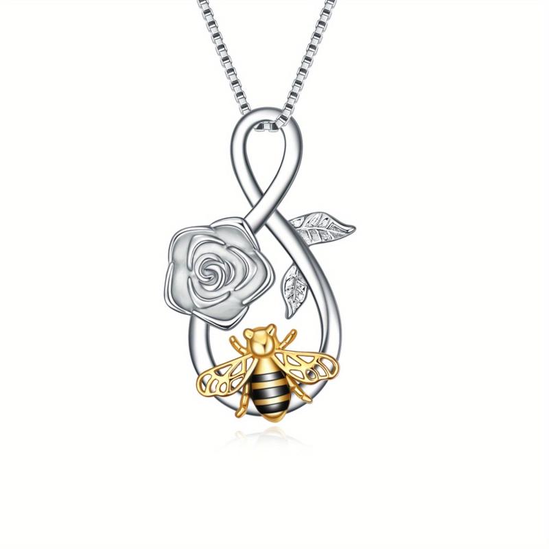 This stunning sterling silver necklace features an infinity bumble bee pendant along with a delicate rose flower. Perfect for women and teens who love nature-inspired jewellery.
