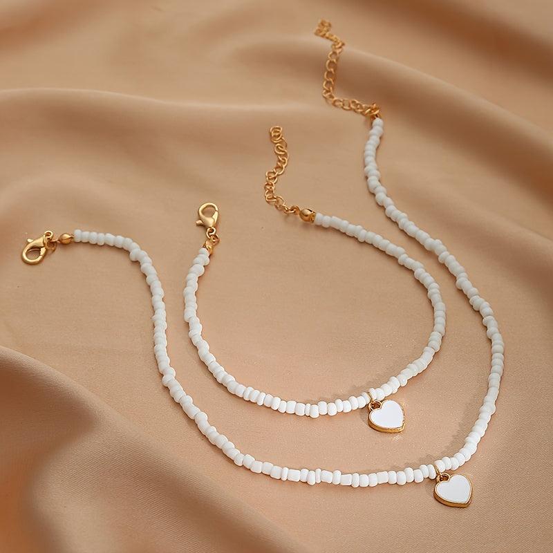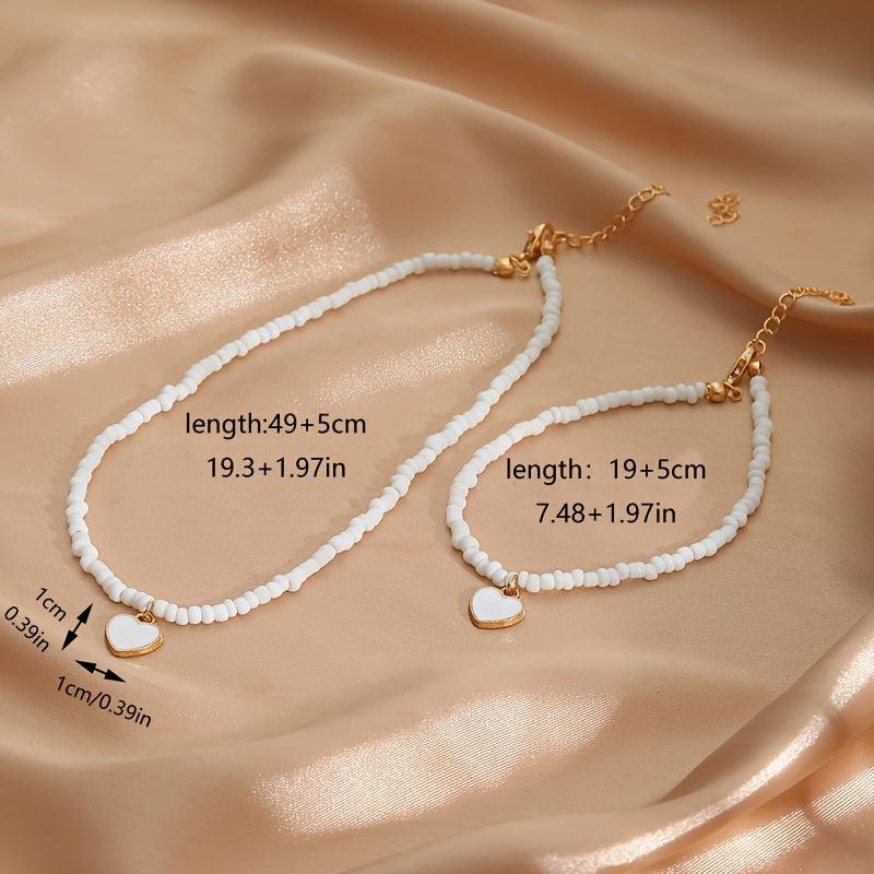 Elegant set with heart pendant, perfect for adding a touch of style to any outfit. Features beaded necklace and matching bracelet.