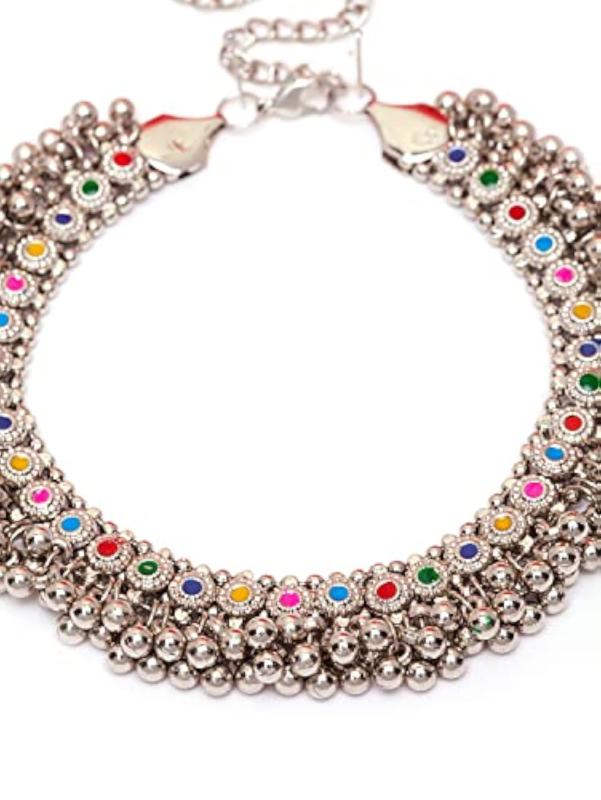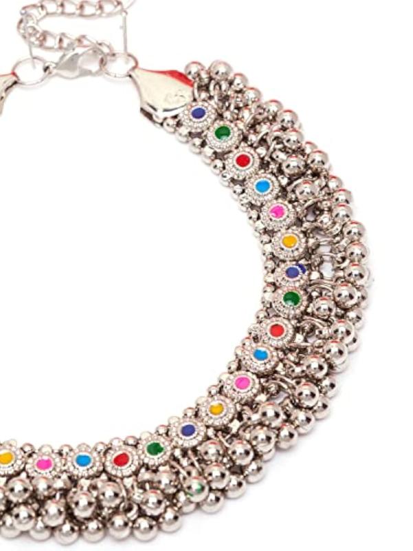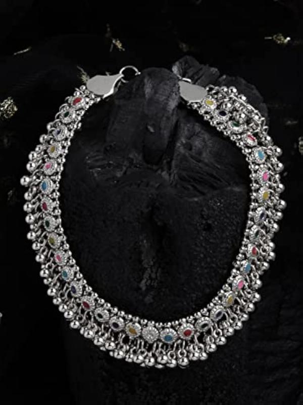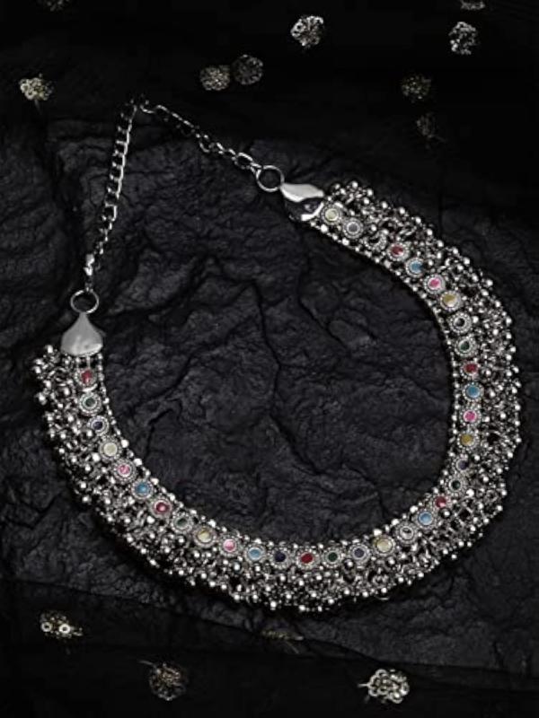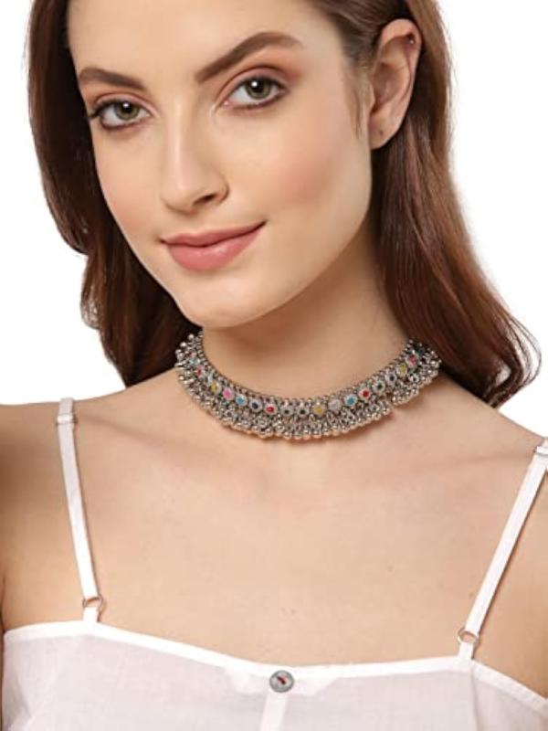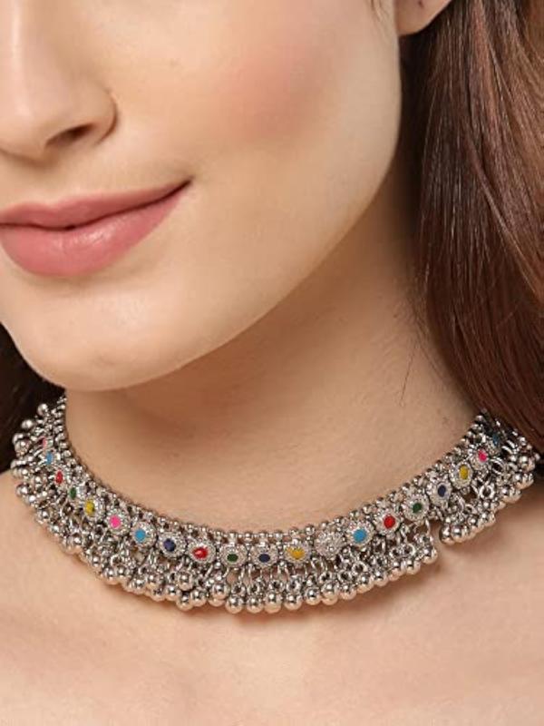Elevate your style with this fancy oxidised silver tribal choker necklace. Perfect for any occasion, this statement piece adds a touch of sophistication to your look.