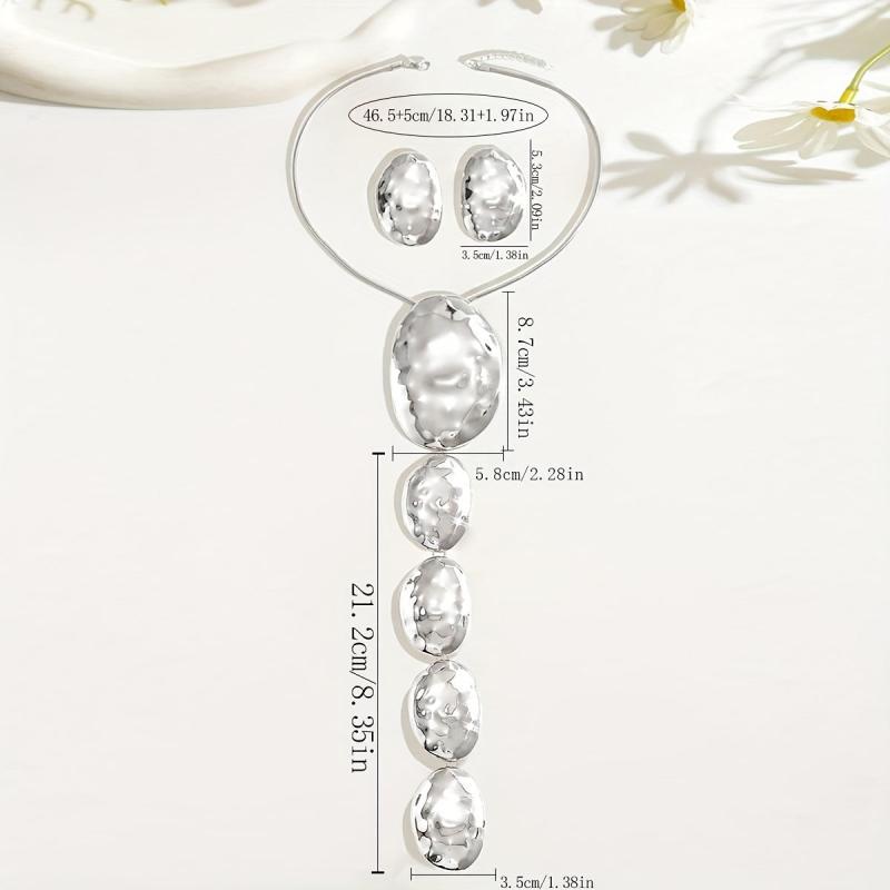 Elevate your style with this bold and modern jewelry set featuring an irregular oval gradient pendant necklace and matching earrings. The beaten texture adds a touch of uniqueness to the design.