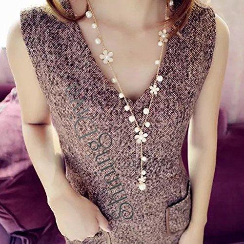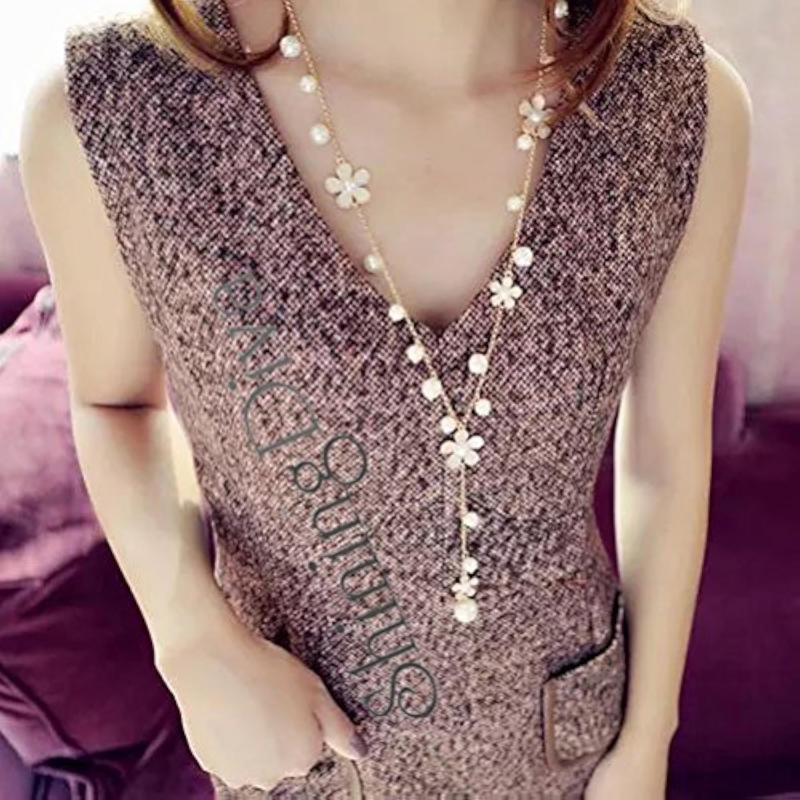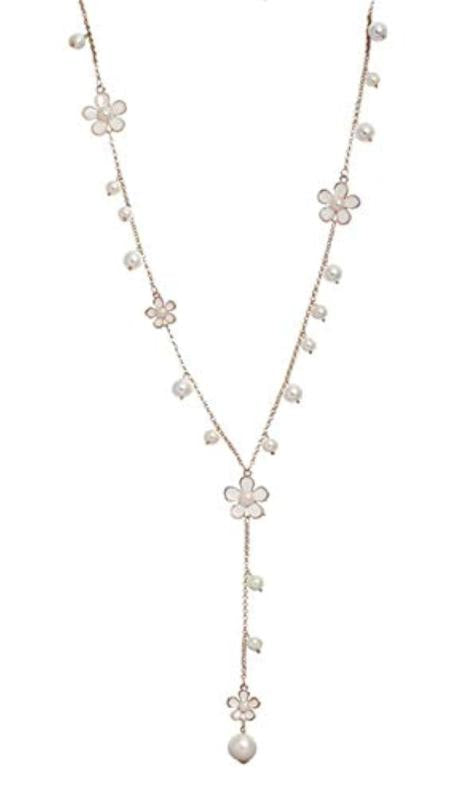 Elegant long chain necklace featuring a beautiful base metal pendant adorned with white pearls and florals.