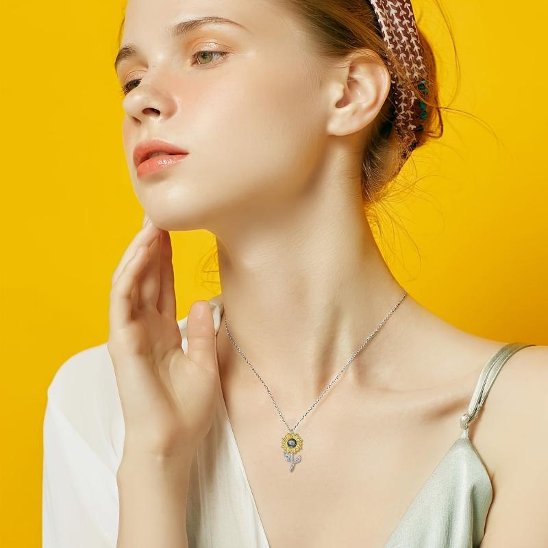 Express your love with this stunning sunflower pendant necklace crafted from 925 sterling silver. The pendant features a hidden message of 'I Love You' in 100 languages, making it a perfect gift for your loved one.