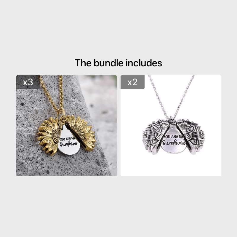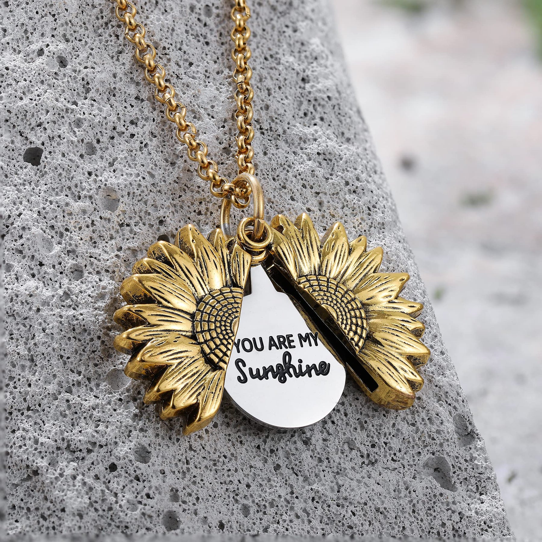 Beautiful sunflower pendant necklace with engraved 'You Are My Sunshine' message.