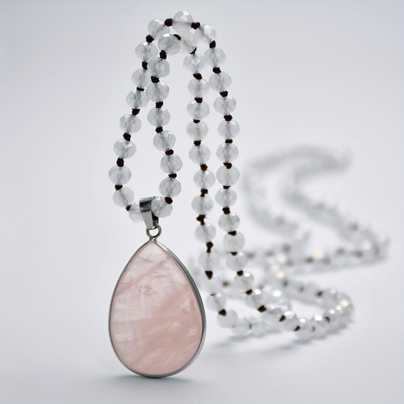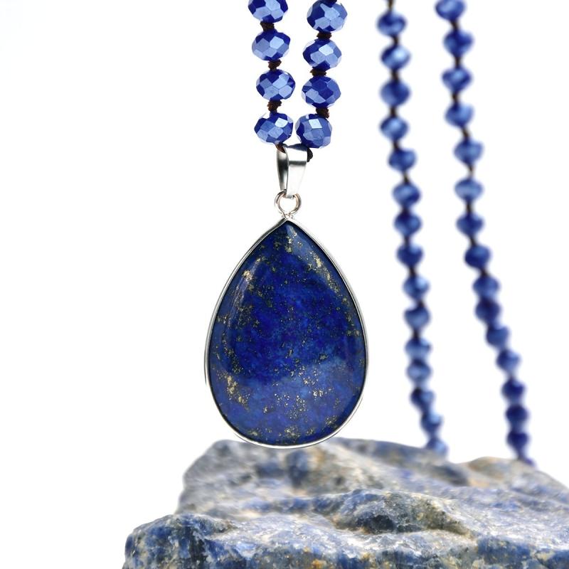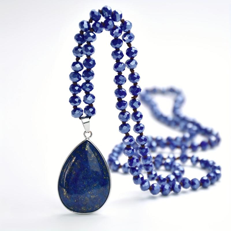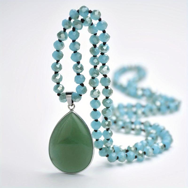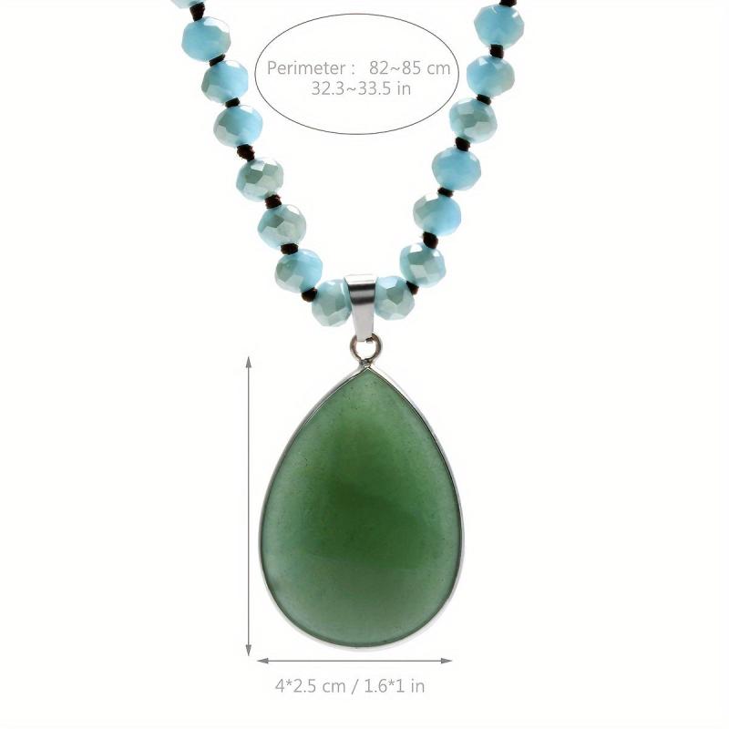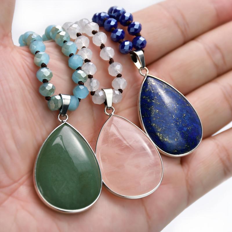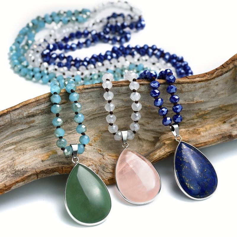 Add a touch of elegance to your fall and winter outfits with this teardrop pendant necklace. Features natural stone pink crystal, lapis lazuli, and green aventurine beads.