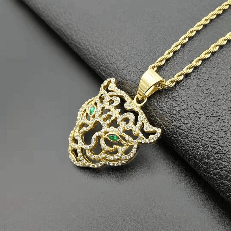 This hip hop jewelry features a tiger head pendant with sparkling cubic zirconia stones on a tennis chain. Perfect for both men and women.