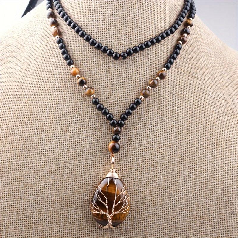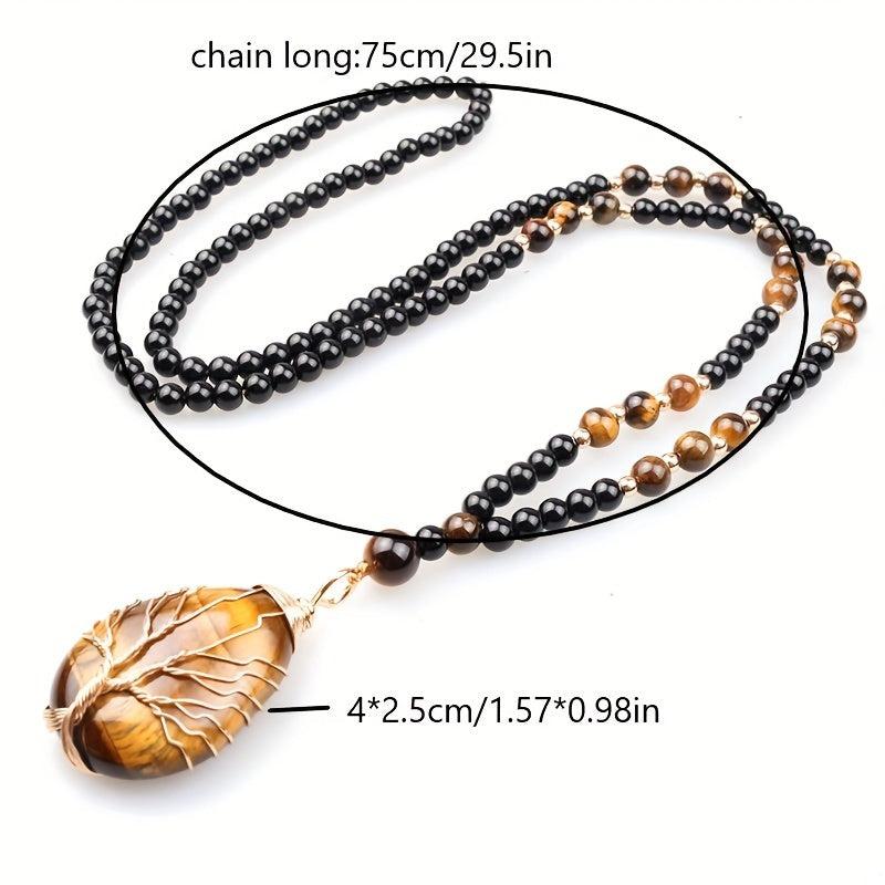 Handcrafted beaded necklace featuring Tiger's Eye tree of life pendant with Amber accents.