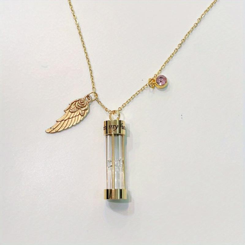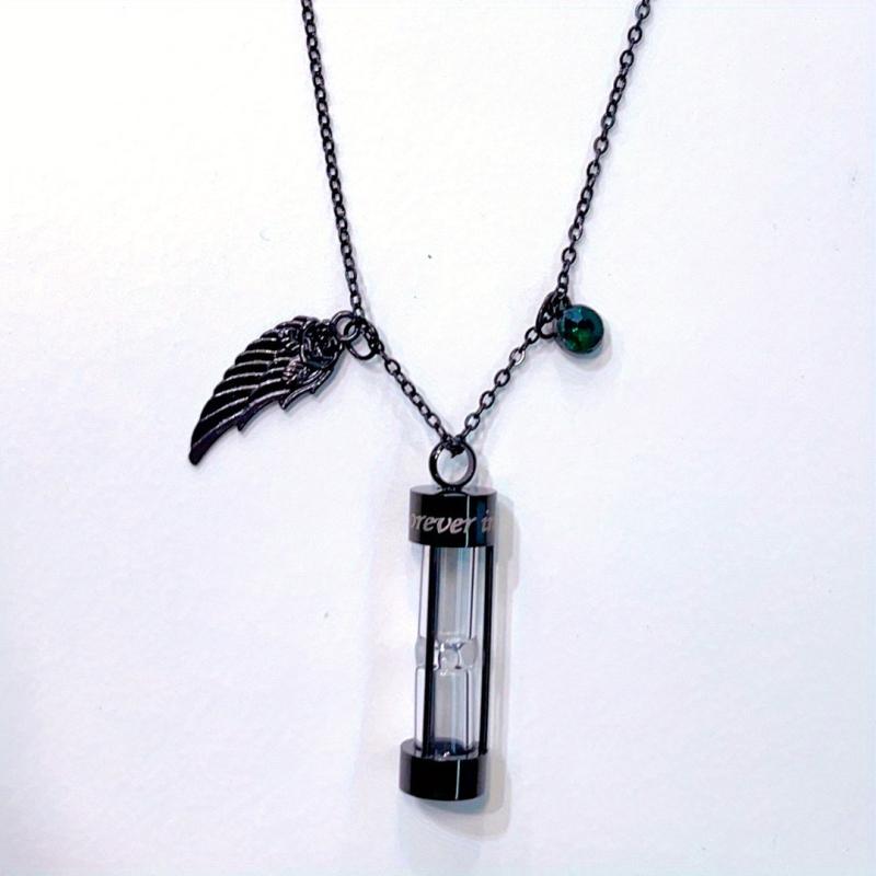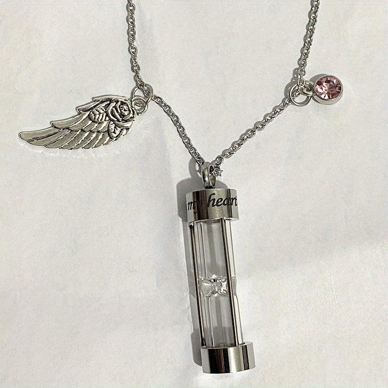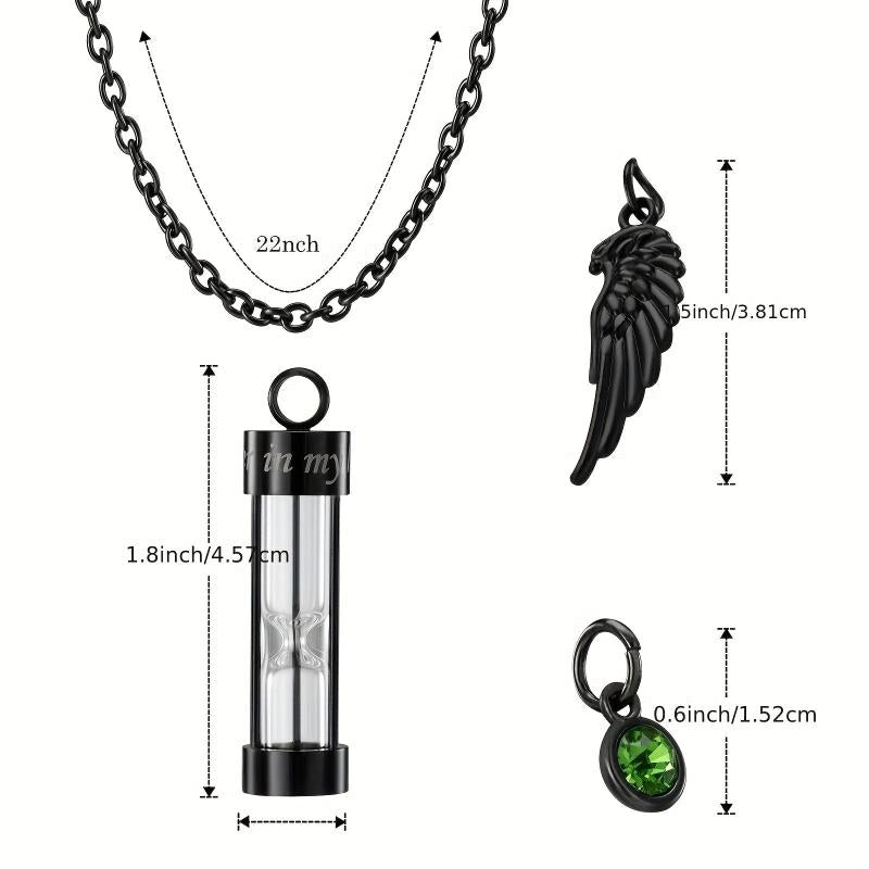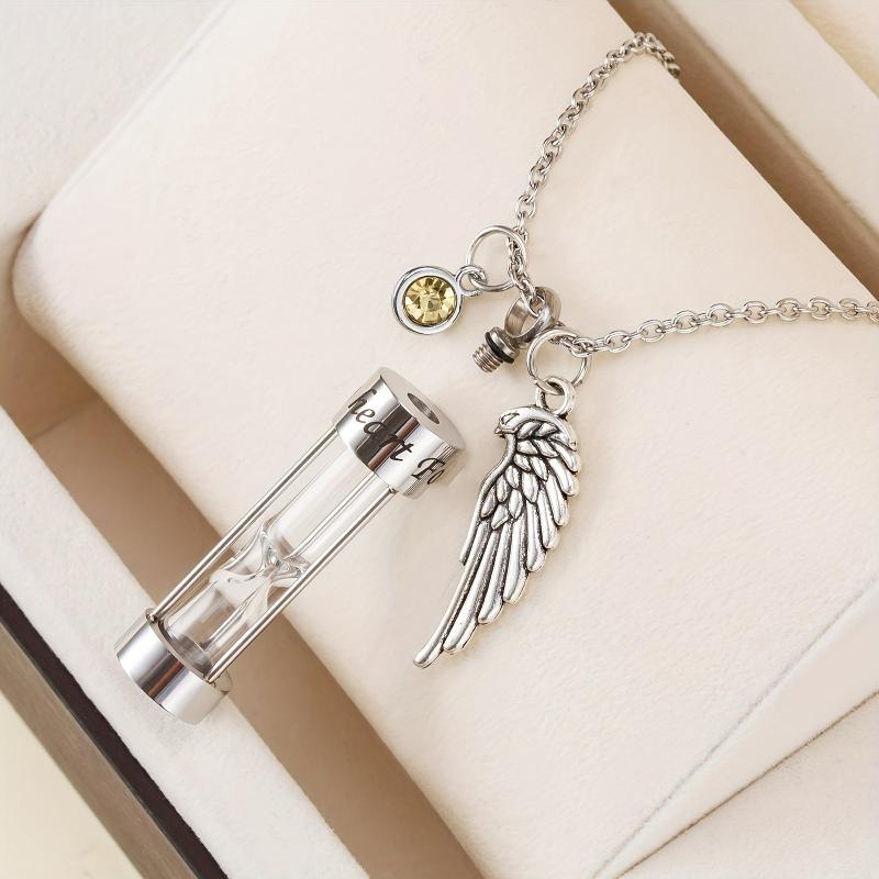 This cremation urn necklace is a beautiful memorial pendant that can hold human or pet ashes. The hourglass design symbolizes the passage of time and memories cherished. It comes with a birthstone and an angel wing charm.