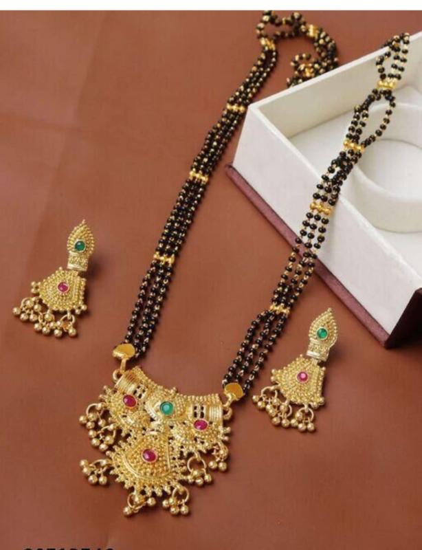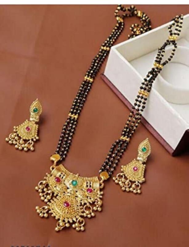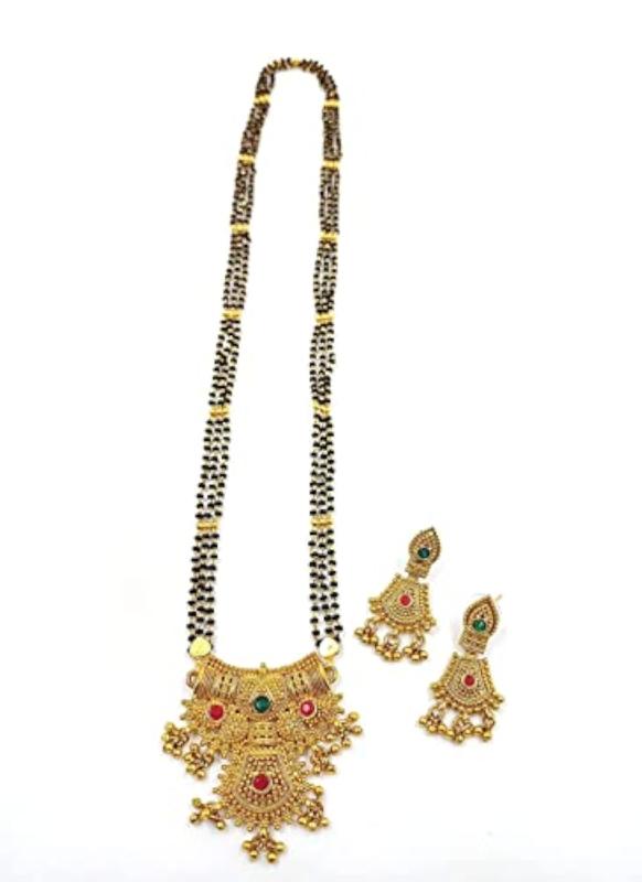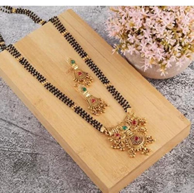 Elegant and traditional long one gram copper and alloy mangalsutra with beads and vati design. Perfect for special occasions.