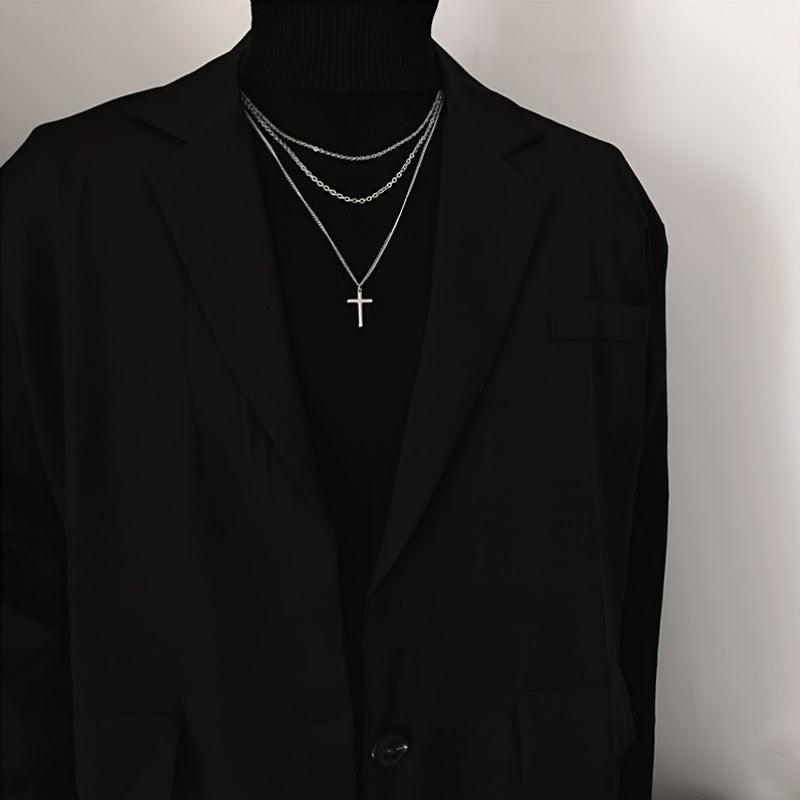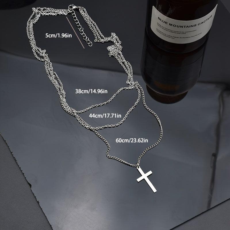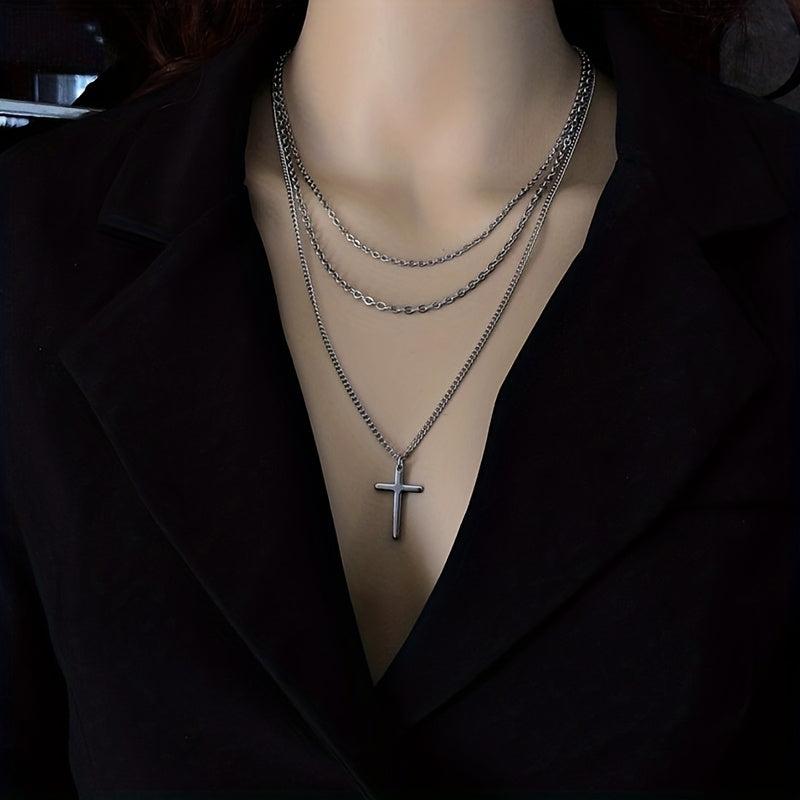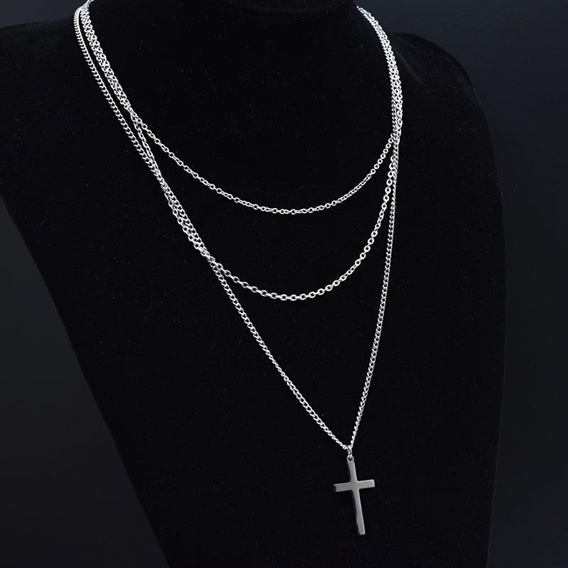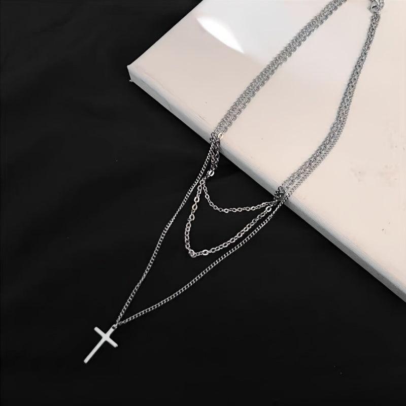 Sophisticated necklace suitable for casual or formal wear. Three-layer design with a cross pendant. Made from iron and alloy with a metallic finish.
