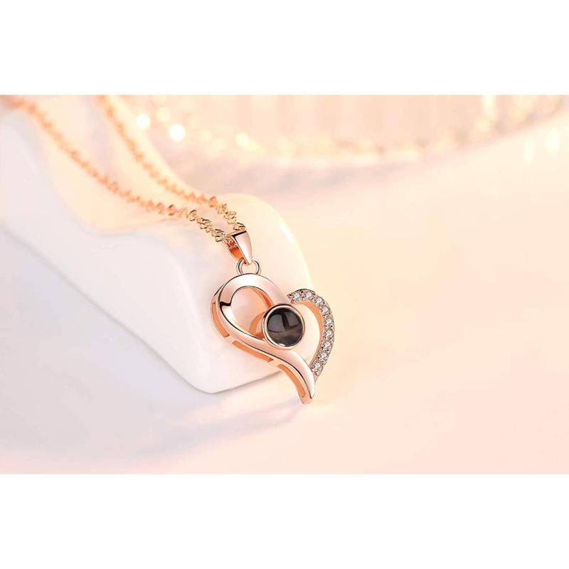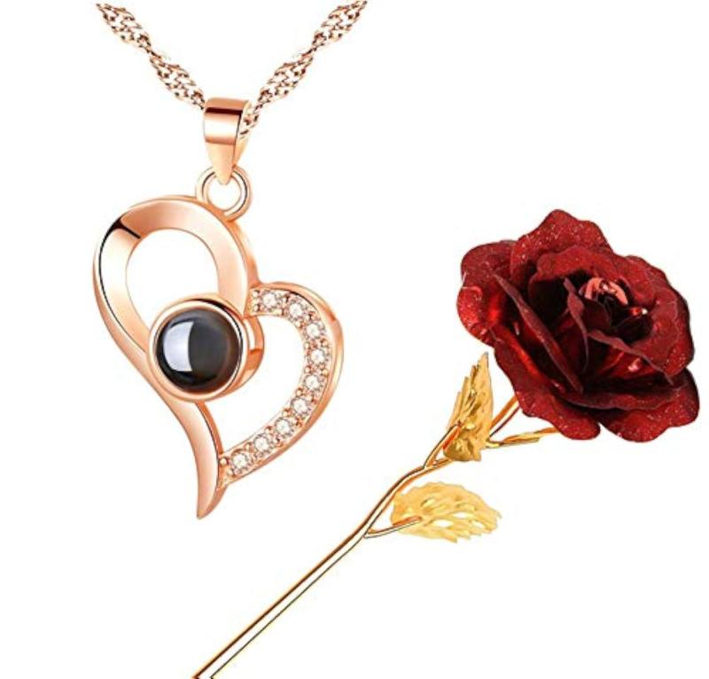 This stunning jewellery combo features a rose flower pendant and a pendant that says 'I love you' in 100 languages. Perfect gift for your loved one on Valentine's Day.
