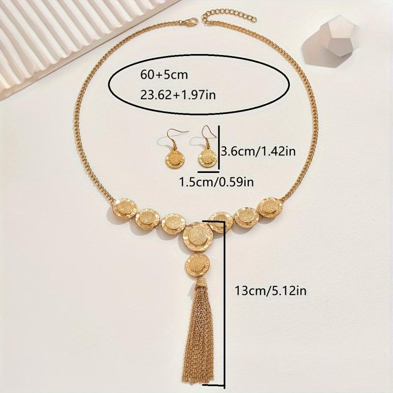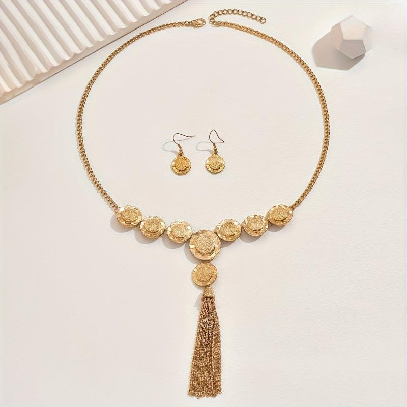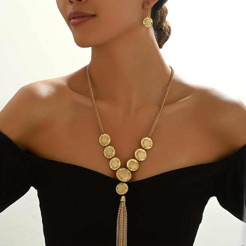 Elevate your style with this stunning vintage-inspired hammered geometric round spliced chain tassel Y necklace and matching earrings set.