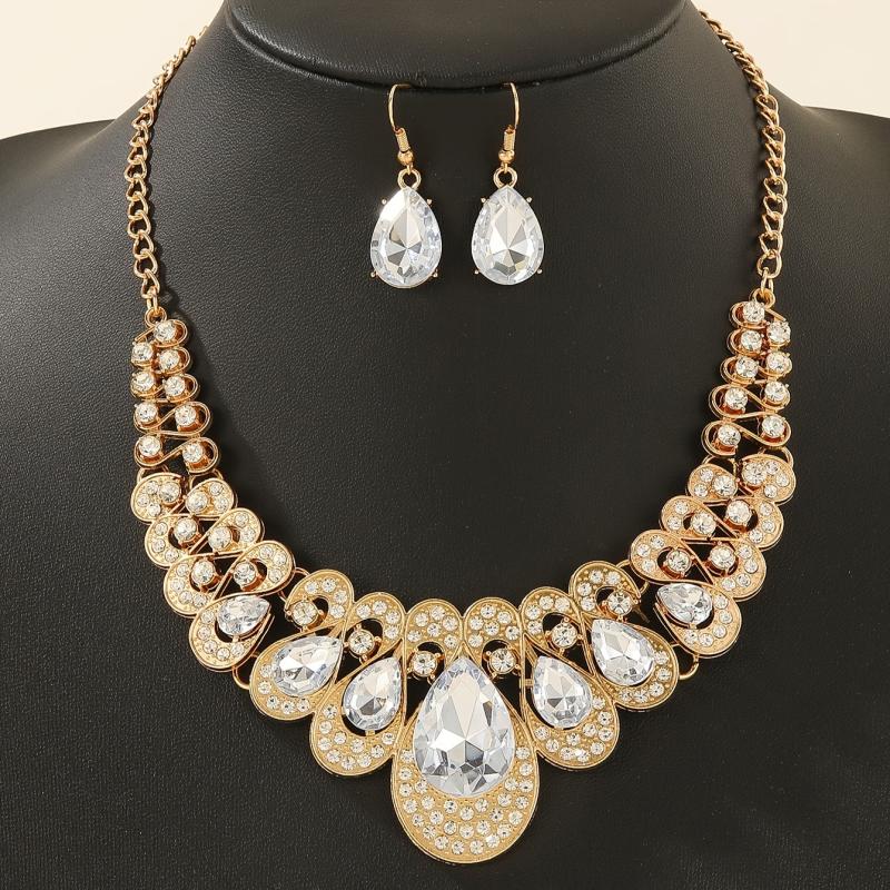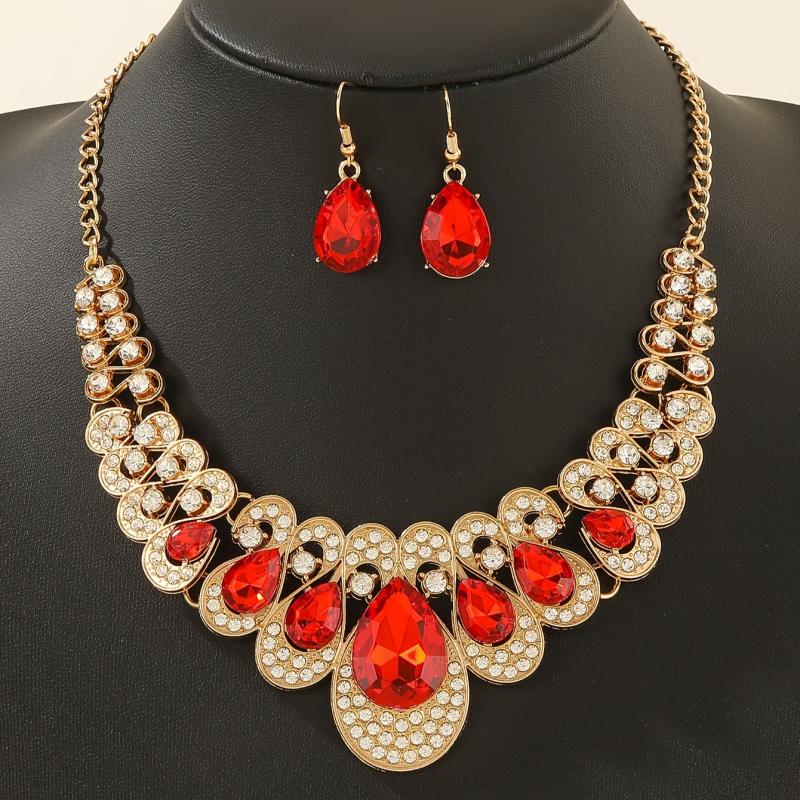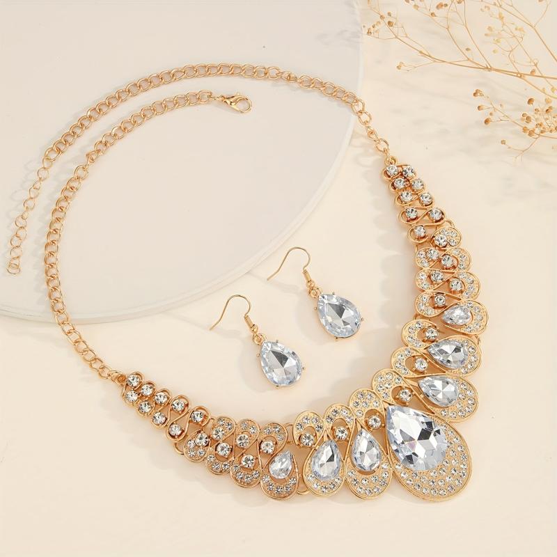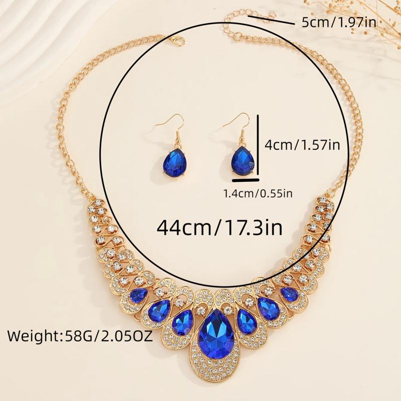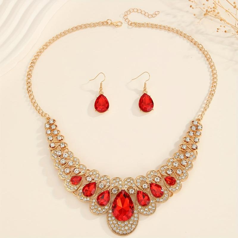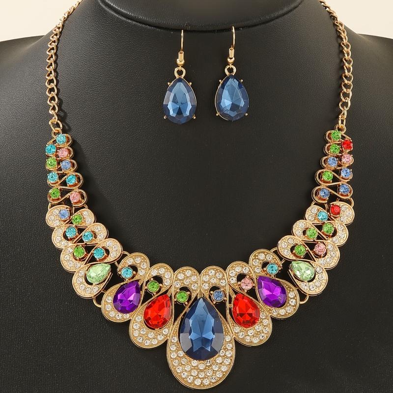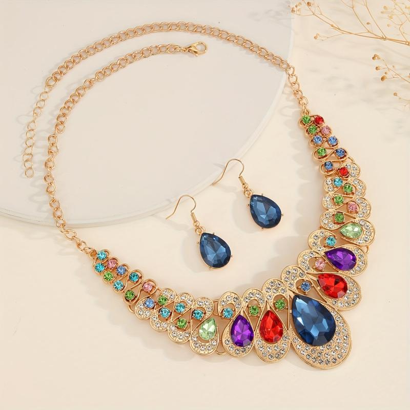 This elegant set features a golden tone metallic design with colorful gemstones and rhinestone accents. Made from zinc alloy, it is perfect for daily wear and special occasions.