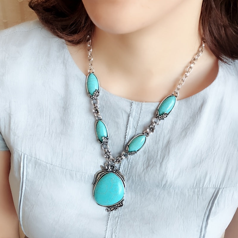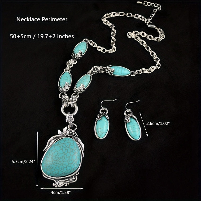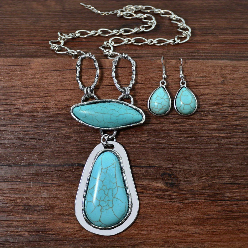 Complete your bohemian look with this striking vintage turquoise necklace set featuring a big pendant and dangle earrings. Perfect for women who love unique jewelry pieces.