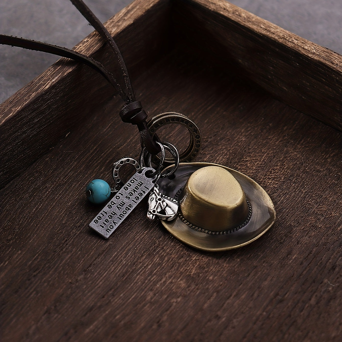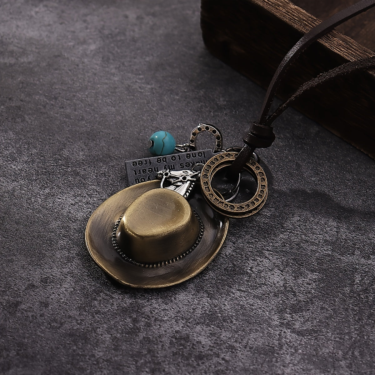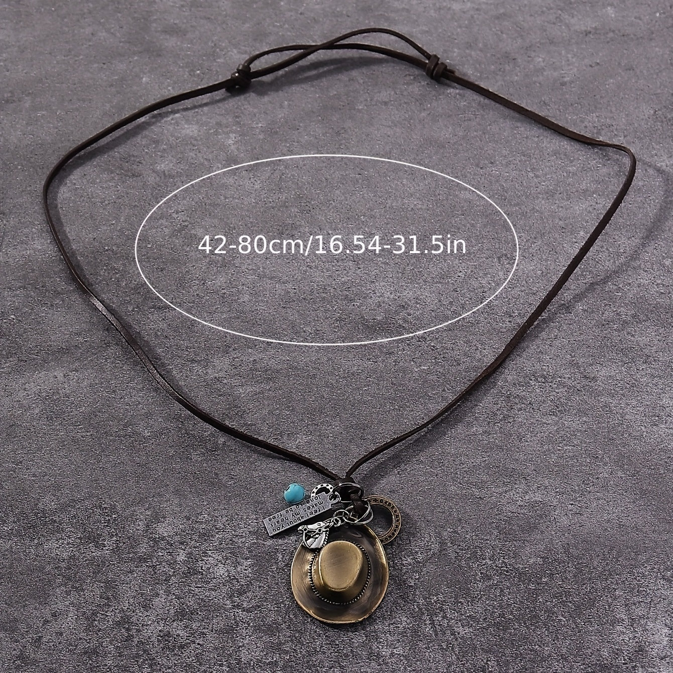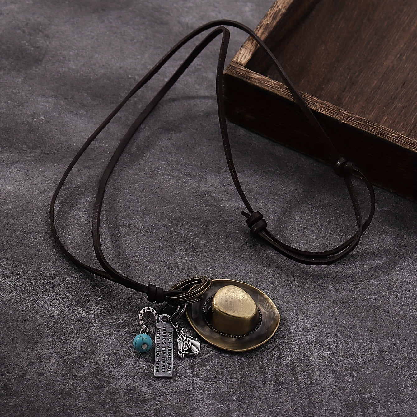 This necklace features a vintage Western style design with a faux leather adjustable hat pendant, perfect for adding an ethnic touch to your jewelry collection.