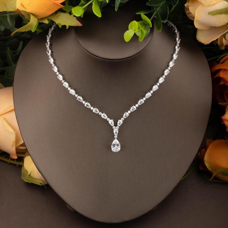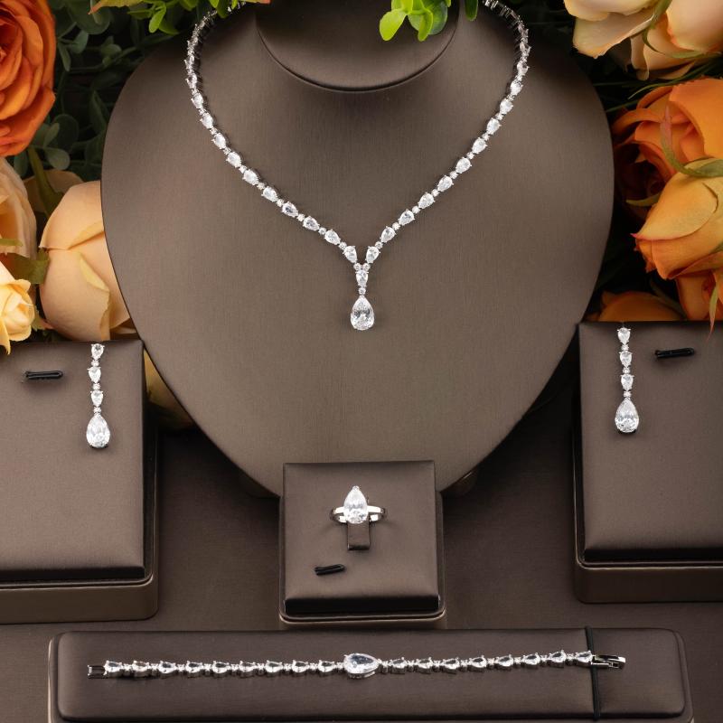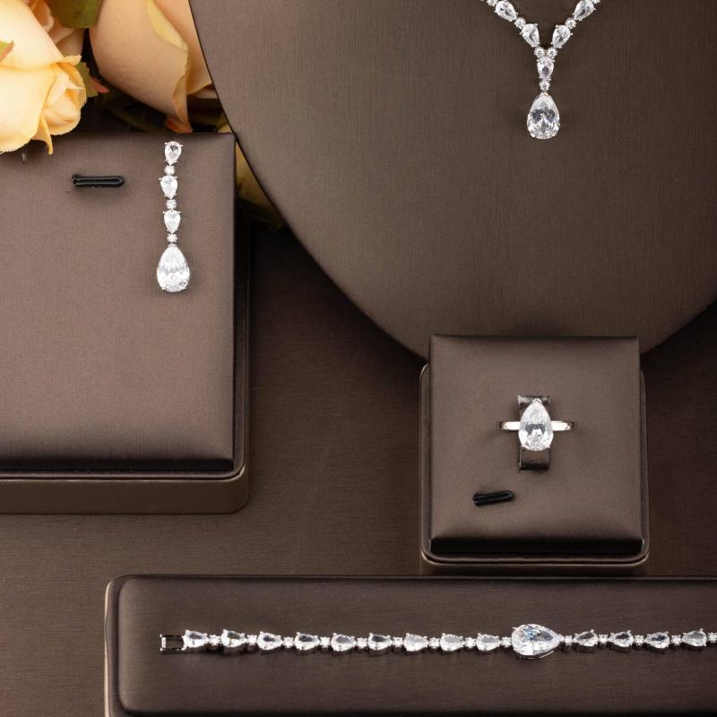 This stunning bridal jewelry set features a water drop shape design with copper inlaid cubic synthetic zirconia, perfect for Middle Eastern weddings and parties.