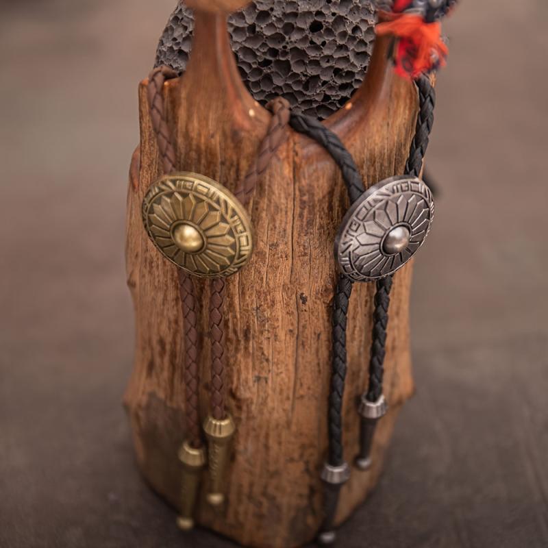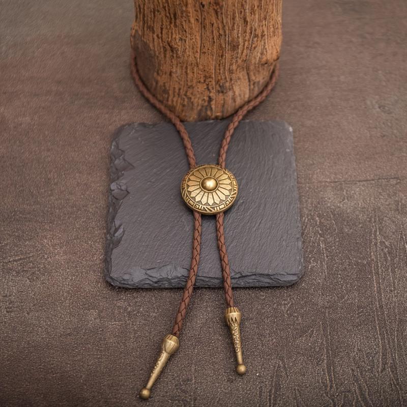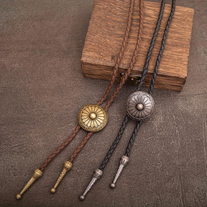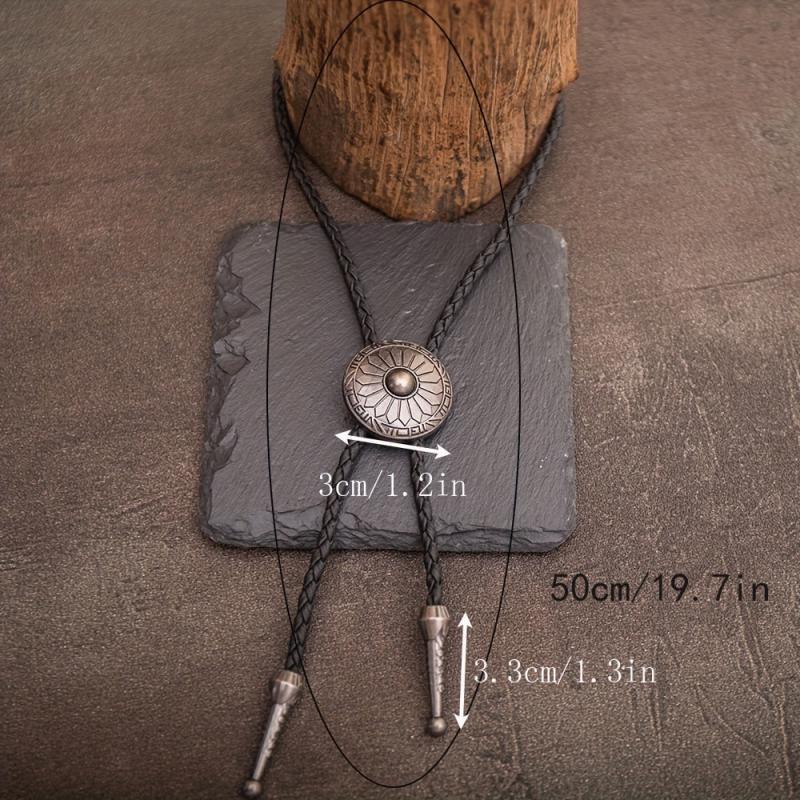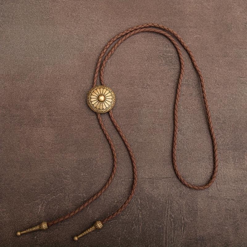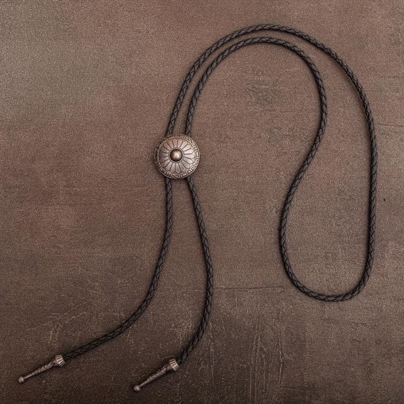 Add a touch of cowboy style with this retro bolo tie necklace featuring a round pattern on a long chain.