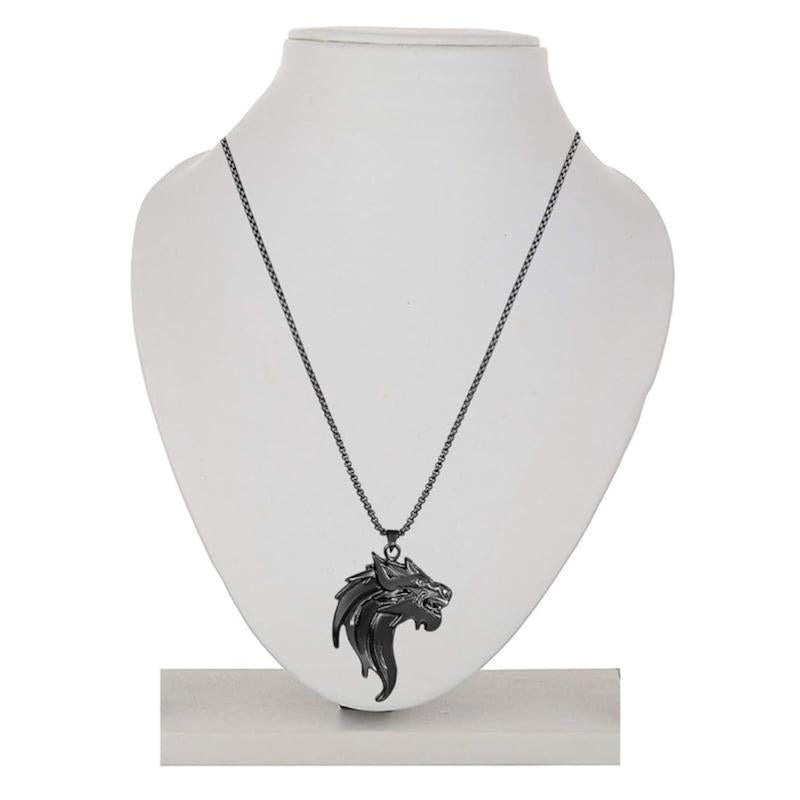 Make a statement with this wolf-shaped pendant necklace featuring a gun metal plating finish. This unique piece is perfect for adding a touch of edgy style to your look.