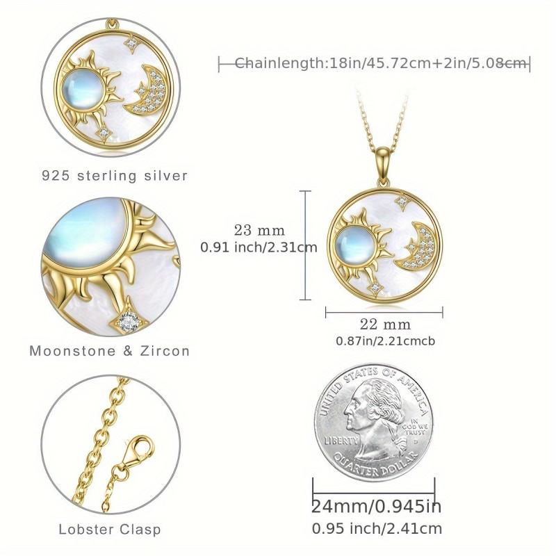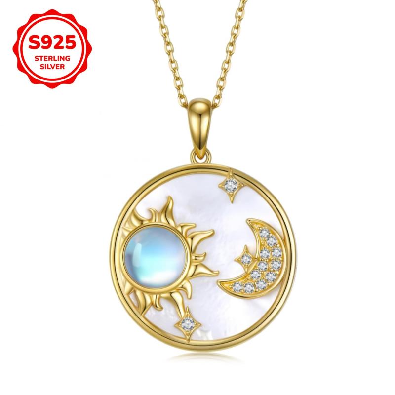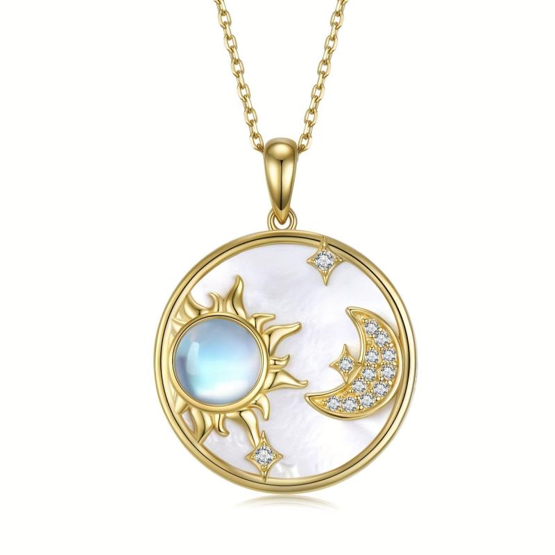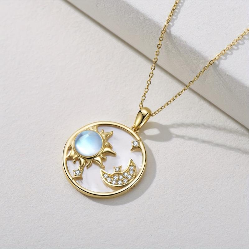 This stylish pendant necklace features a moonstone inlaid shell sun moon star pendant, perfect for daily wear and gift giving. Hypoallergenic and lightweight.