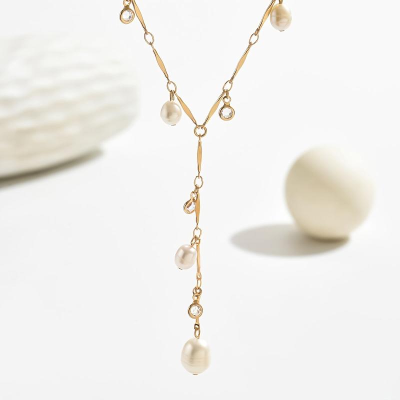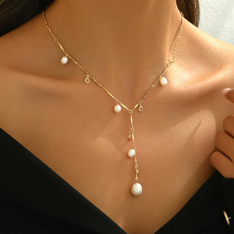 This Y-shaped freshwater pearl necklace features a bohemian style design that is perfect for daily wear and everyday jewelry. The plating adds a touch of elegance to the piece.