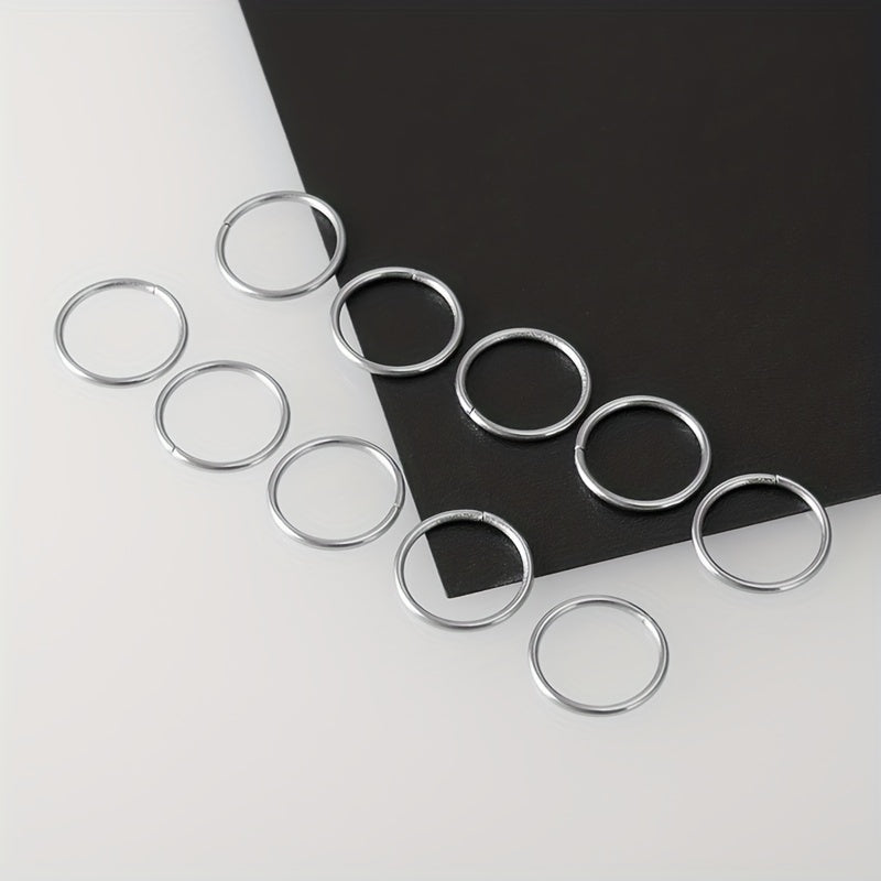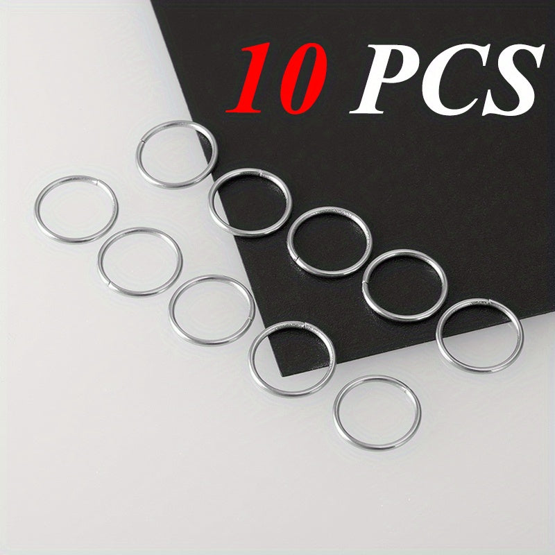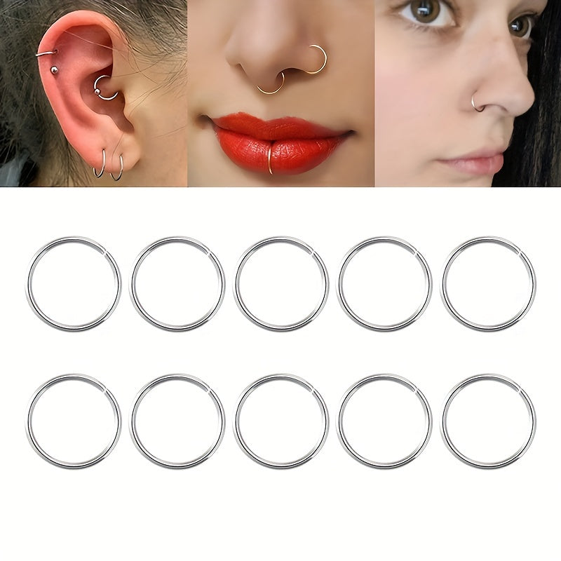 This set includes 10 stainless steel hoop rings perfect for nose, cartilage, tragus, septum, and lip piercings.