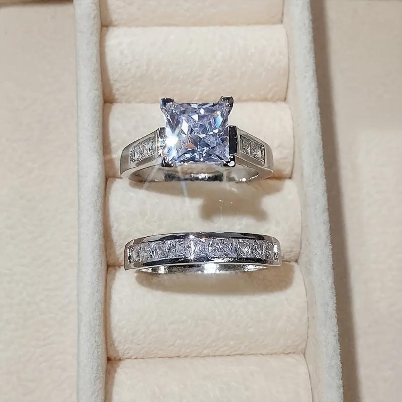 Upgrade your jewelry collection with this elegant 2-piece ring set. Crafted with 18K gold plated copper, featuring princess cut synthetic zirconia stones in a 4-prong setting. Perfect for daily wear or special occasions.