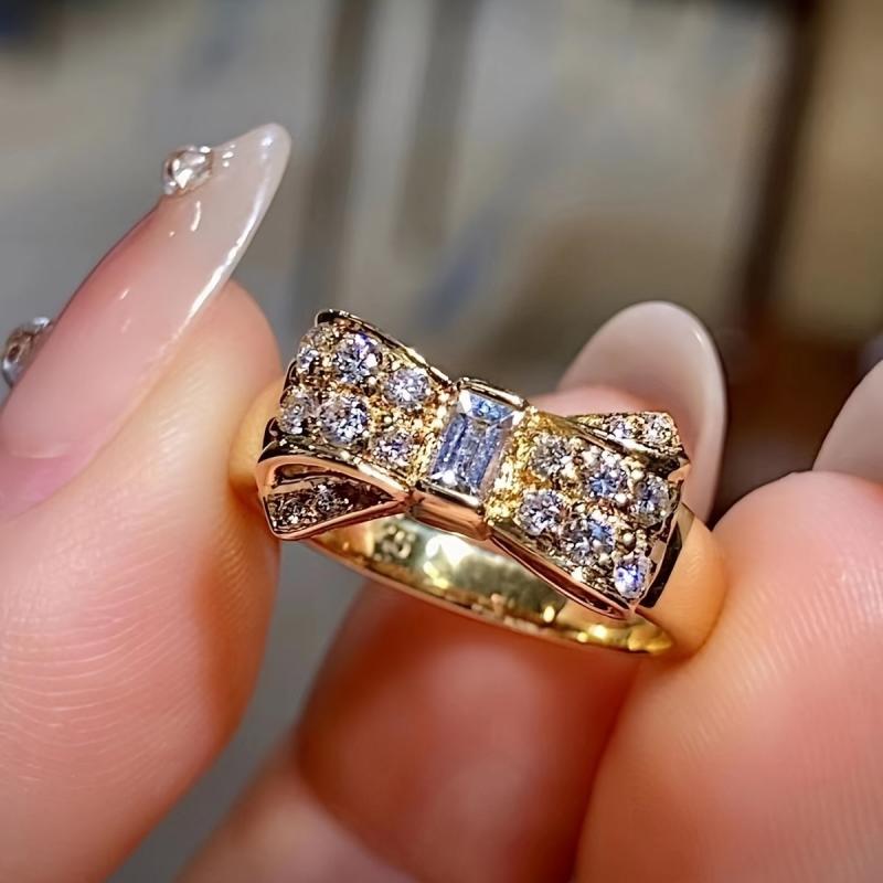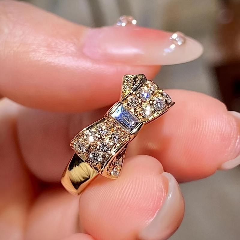 Add a touch of glamour to your look with this stunning 18K gold plated ring featuring bow design and synthetic zirconia accents. Perfect for daily wear or special occasions.