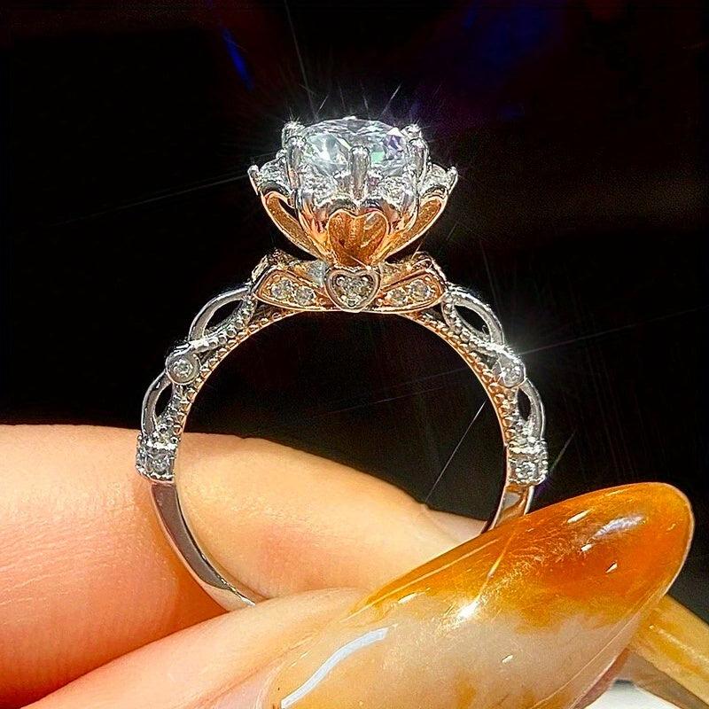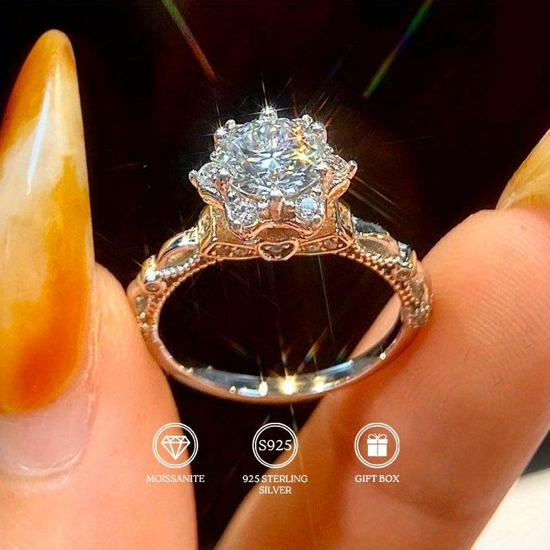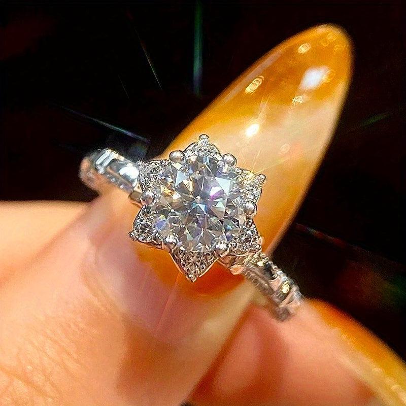 This stunning sunflower engagement ring features a 1ct Moissanite center stone set in a beautiful design crafted from S925 sterling silver.