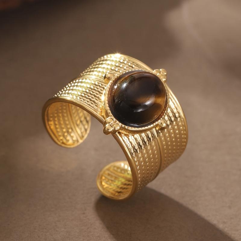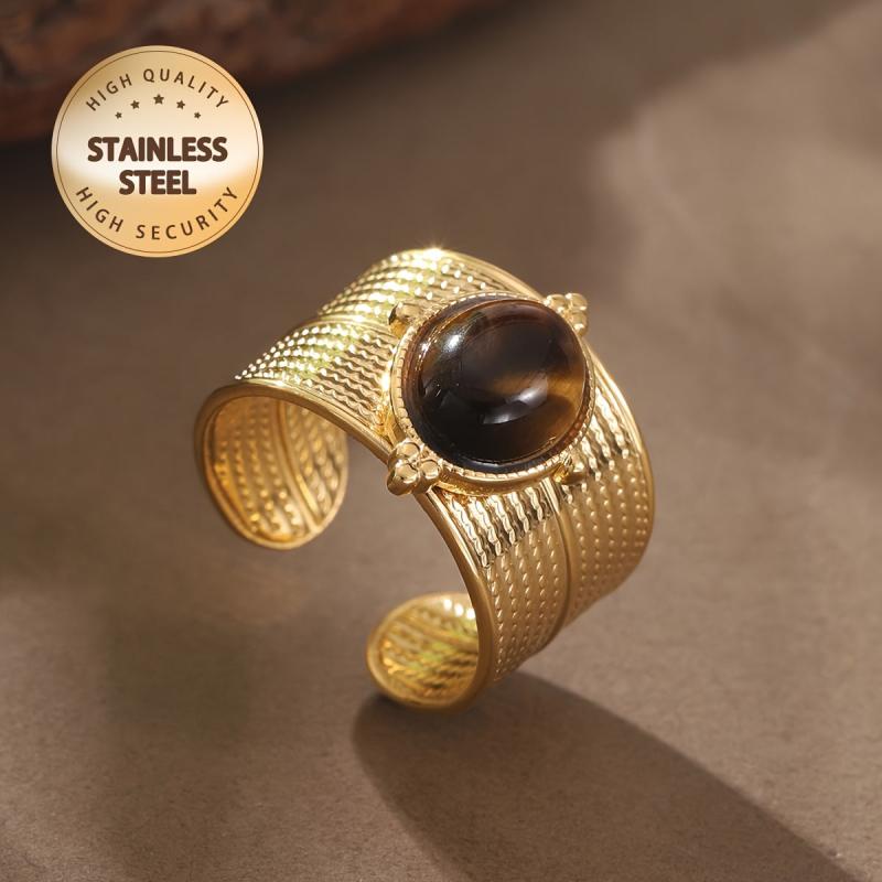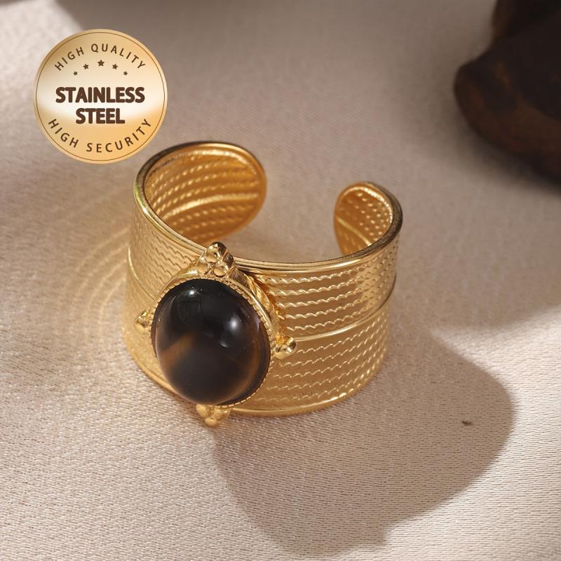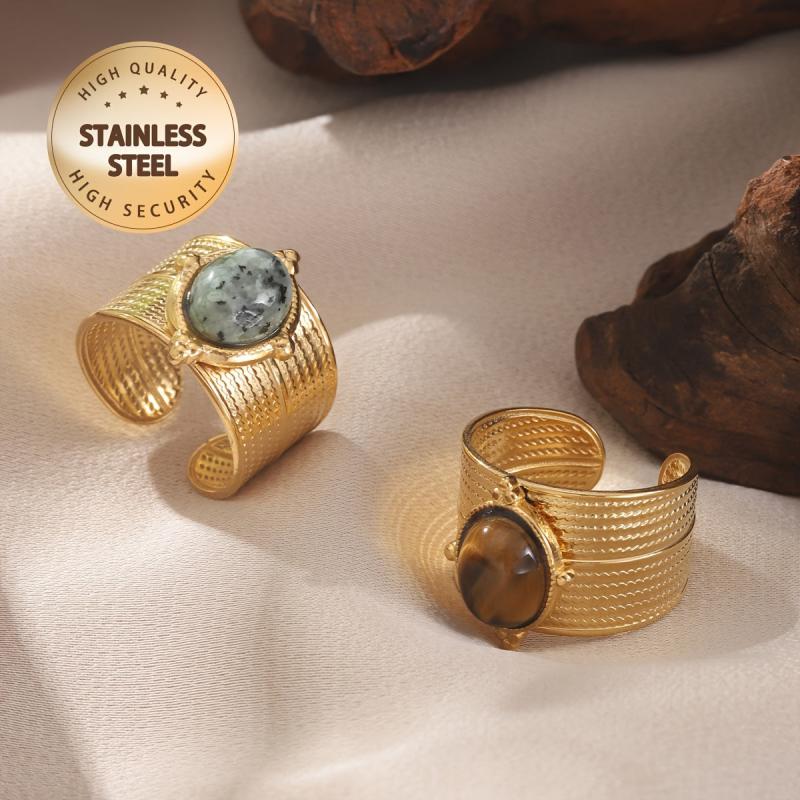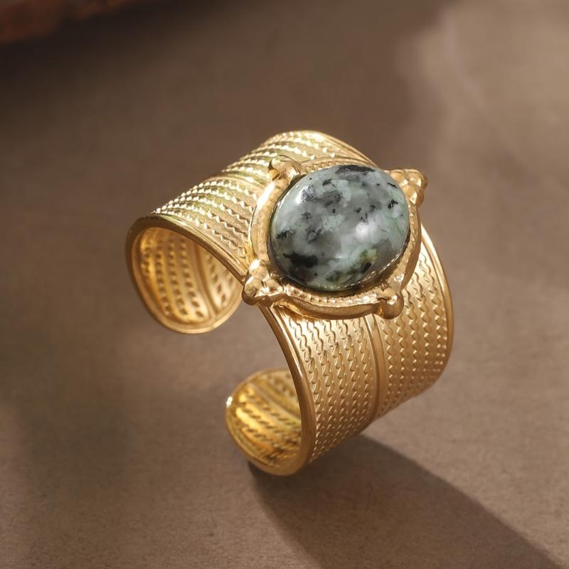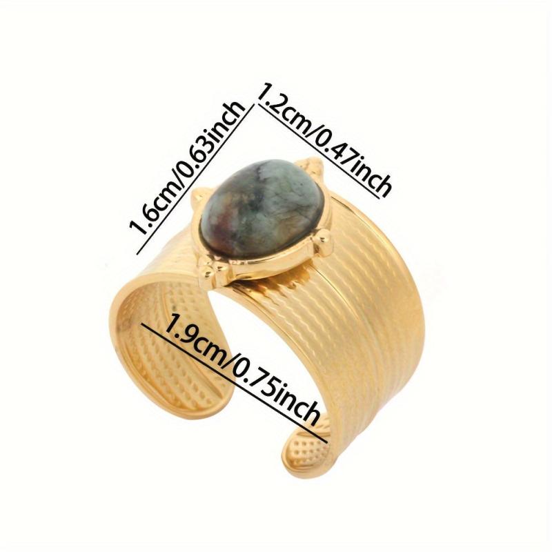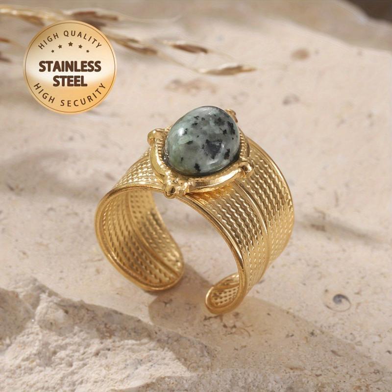 This stylish ring is made of stainless steel with a natural stone accent. Perfect for French-inspired accessories for ladies. Each piece is unique, and the pattern position will vary.