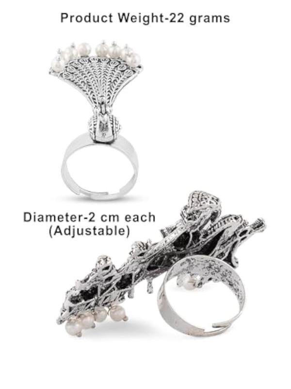Add a touch of elegance with this stunning finger ring featuring a two-tone antique oxidized finish. The ring is adjustable to fit various finger sizes.