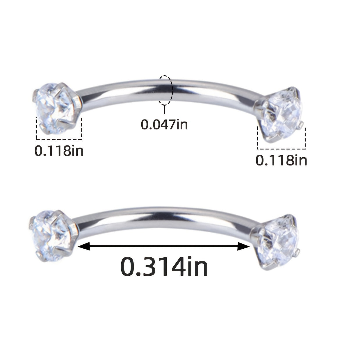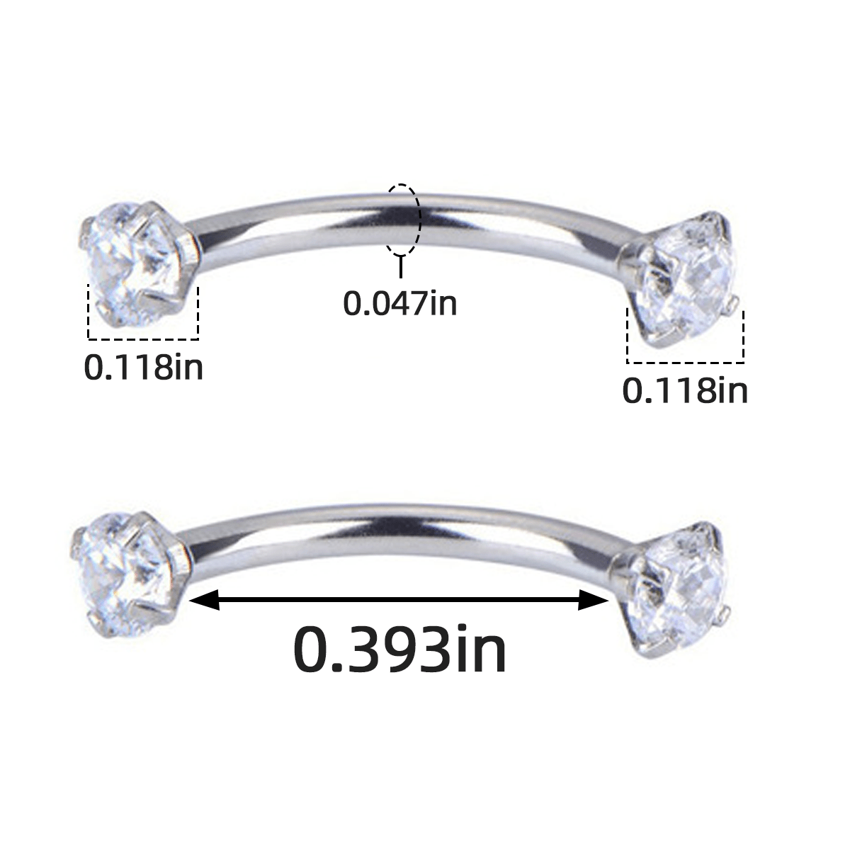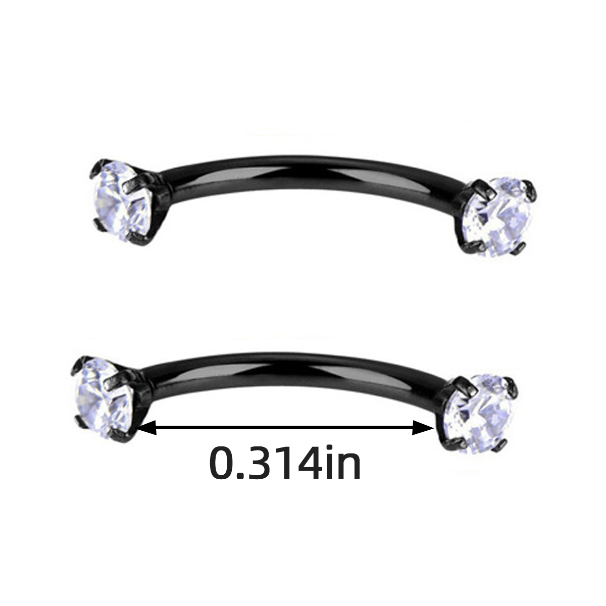 These curved barbell eyebrow tragus rings feature clear cubic zirconia. Available in 8mm and 10mm lengths.