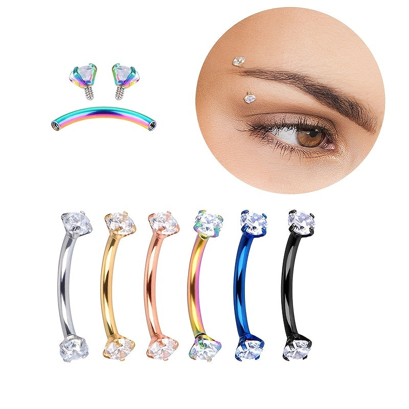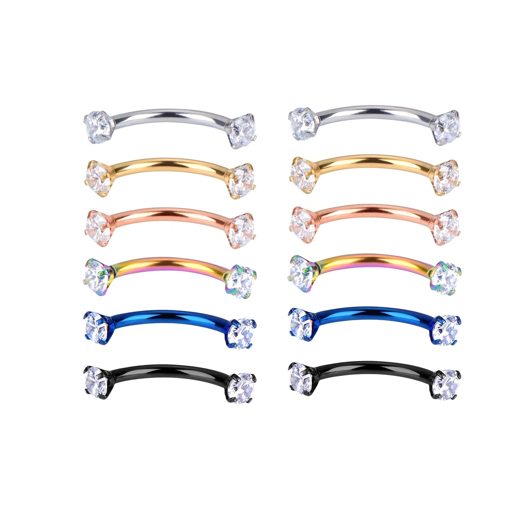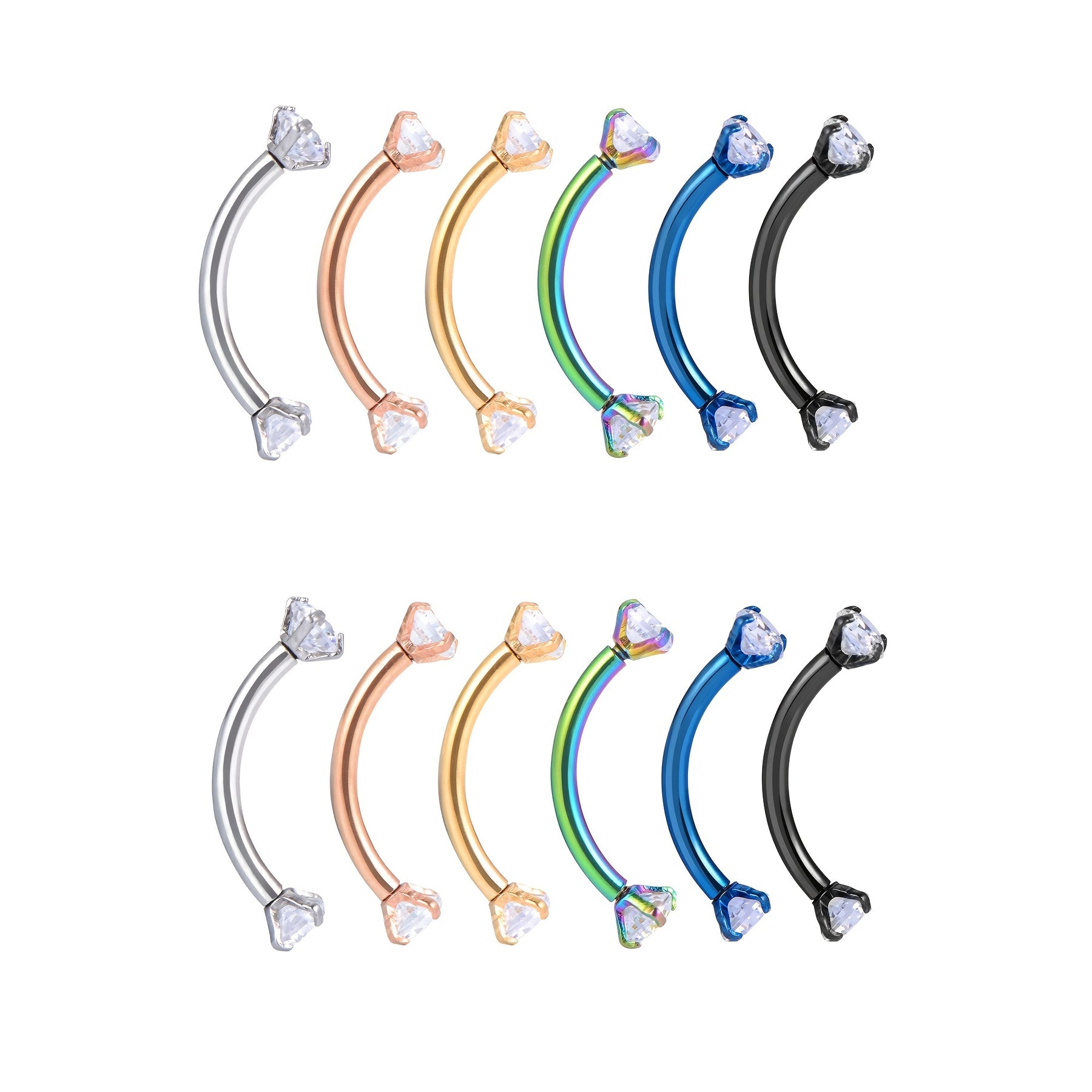 These curved barbell eyebrow tragus rings feature clear cubic zirconia. Available in 8mm and 10mm lengths.