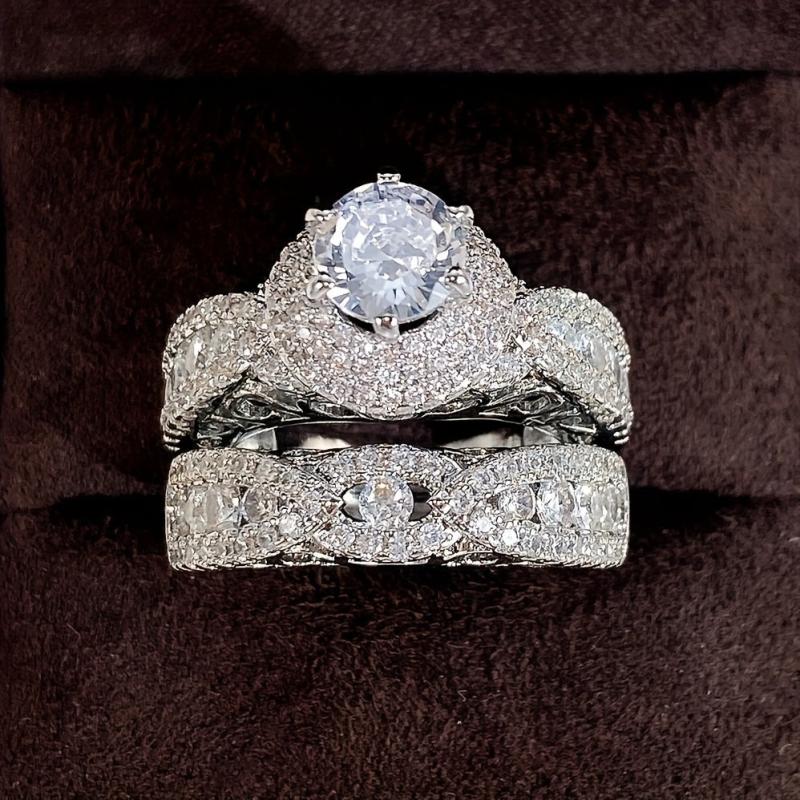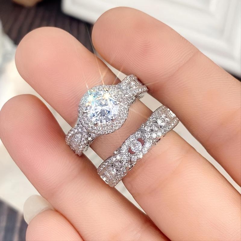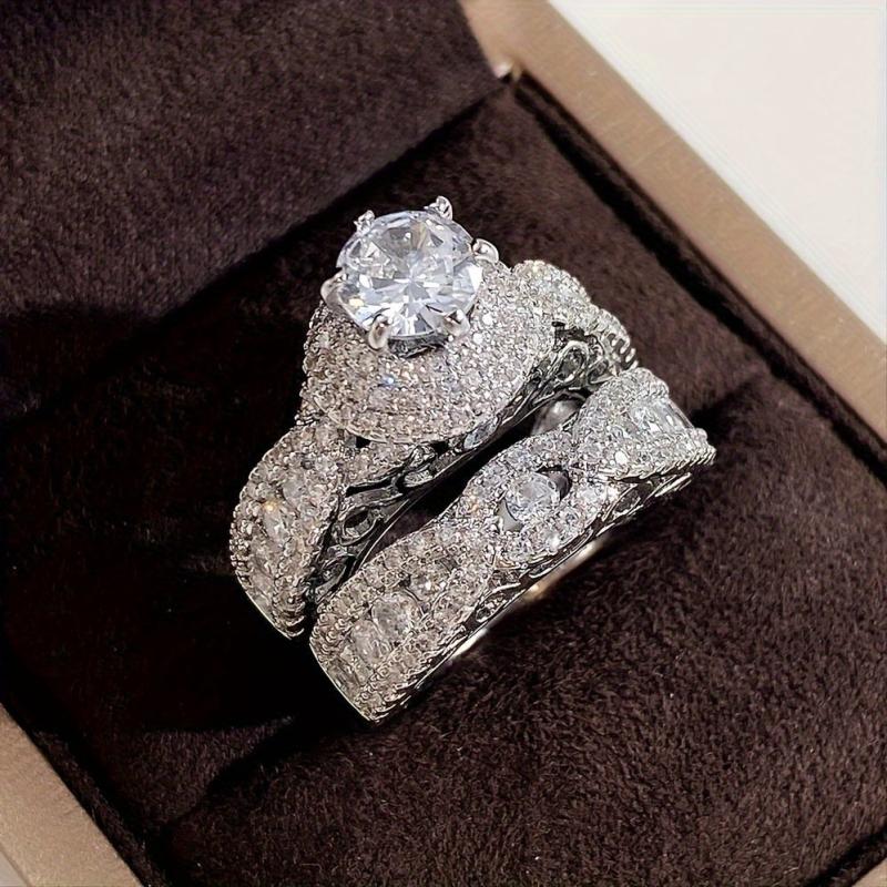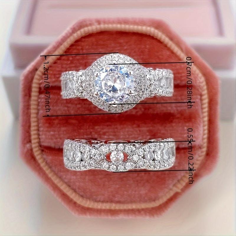 This wedding ring set features micro pave zirconia and copper material, ideal for special occasions or casual attire.