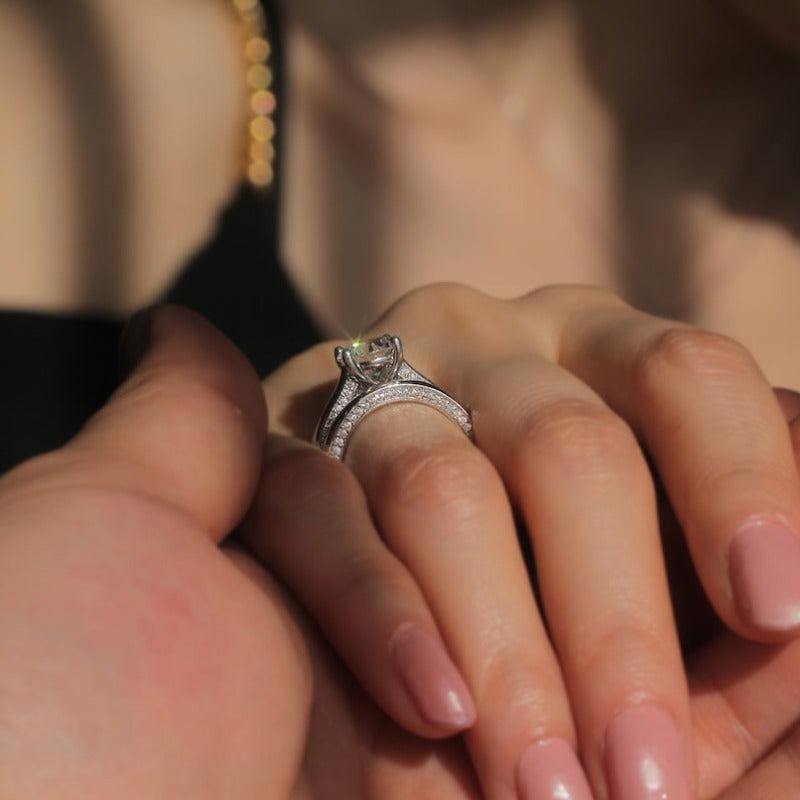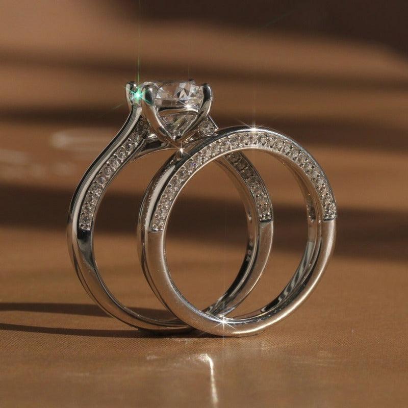 This stunning engagement ring set features round synthetic zirconia stones in a 4 prong setting on a copper base. Perfect for all seasons and holidays, with an April birthstone finish.