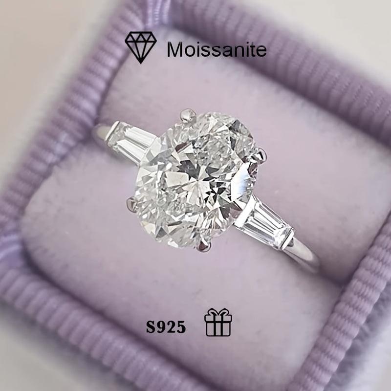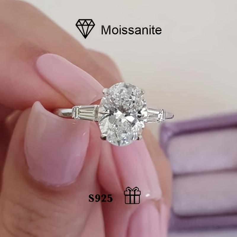 This stunning ring features a three-stone design with a 2ct egg-shaped Moissanite set in s925 silver. Ideal for proposals and engagements, this ring is low-allergy and comes packaged beautifully.