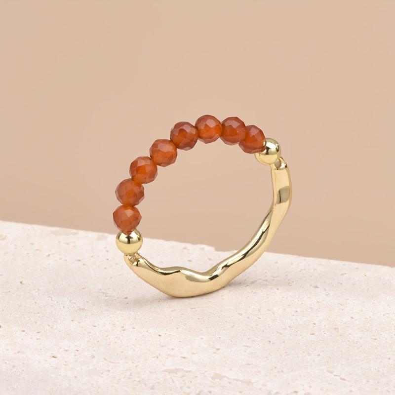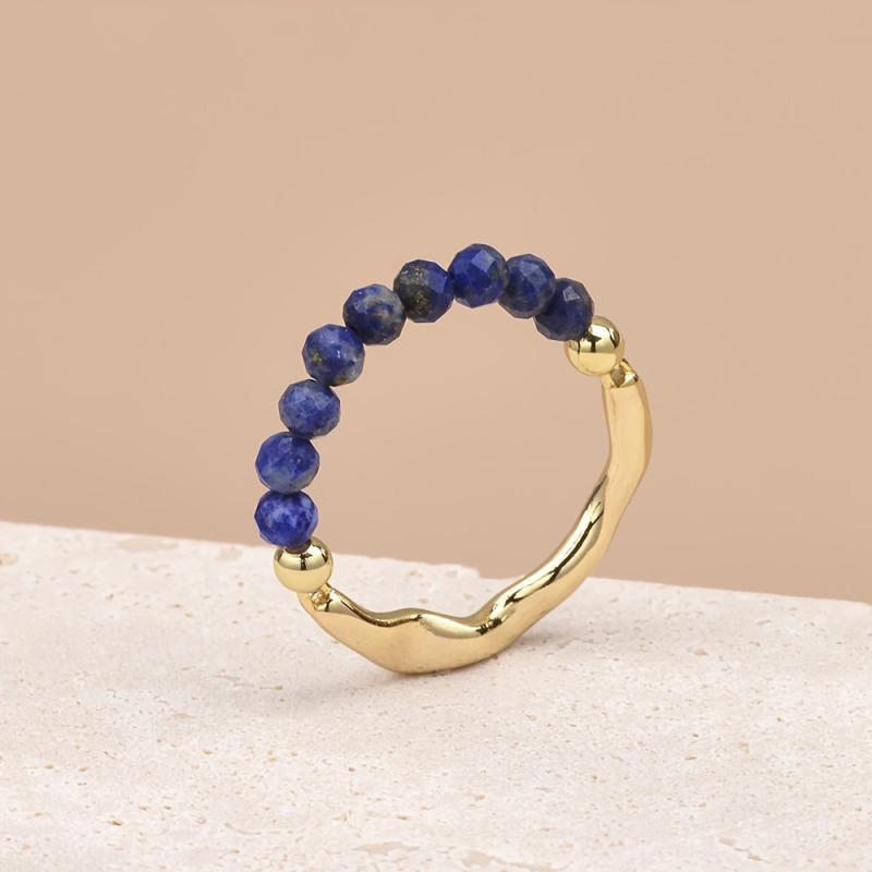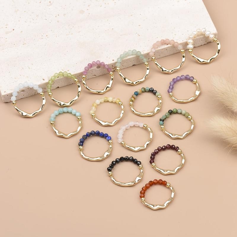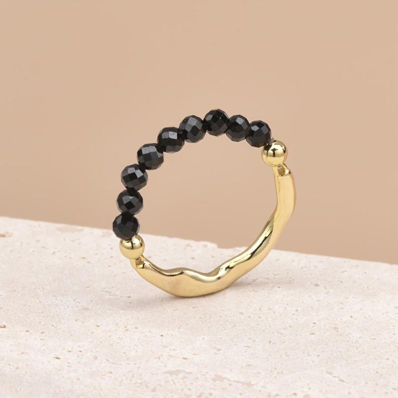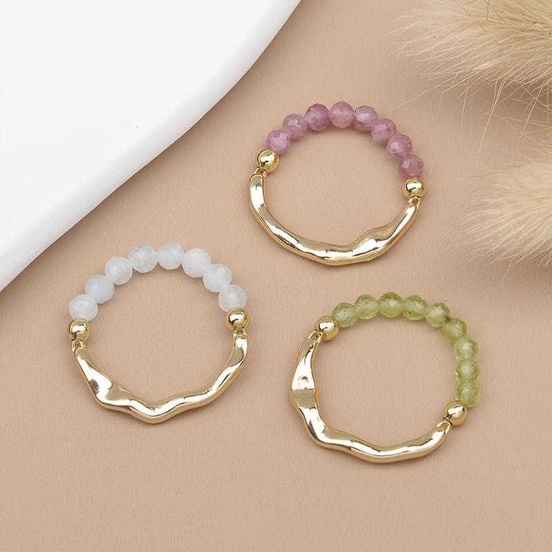 This minimalist ring features 3mm natural stone beads in Spinel, Olive, Sunstone, and Moonstone on a golden tone metal band. Perfect for everyday wear or as a thoughtful gift.