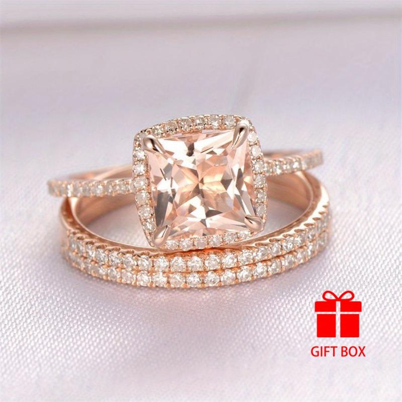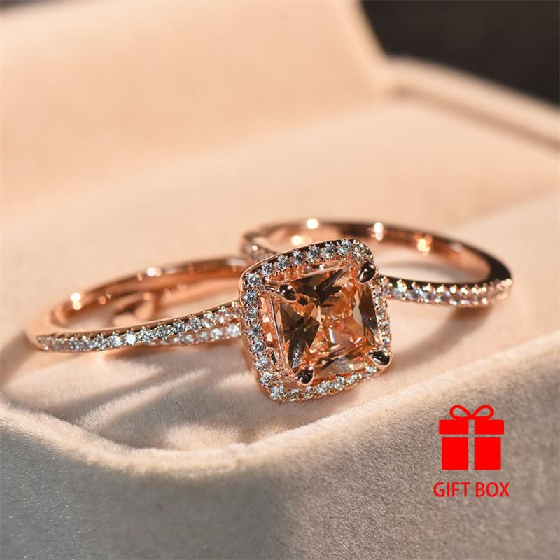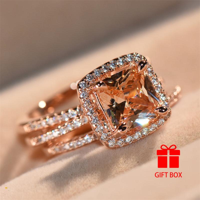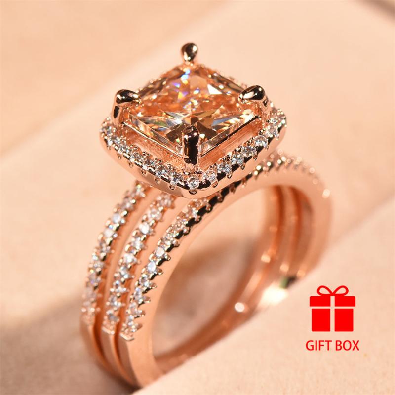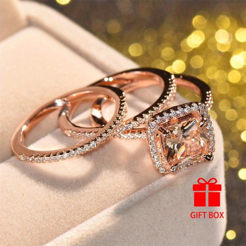 Elegant set of 3 princess cut champagne zirconia rings in rose gold, perfect for weddings, parties, holidays, and daily wear. Durable and stylish accessory.
