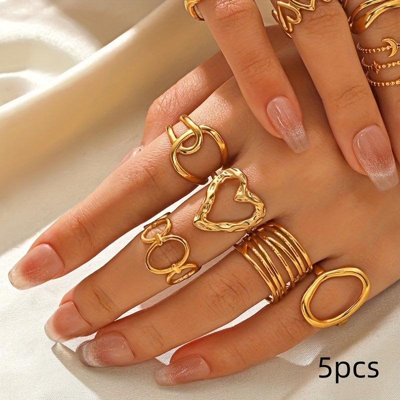 Add a touch of elegance to your look with these beautiful golden stainless steel rings featuring heart, star, and moon designs. The adjustable design ensures a comfortable fit for all.