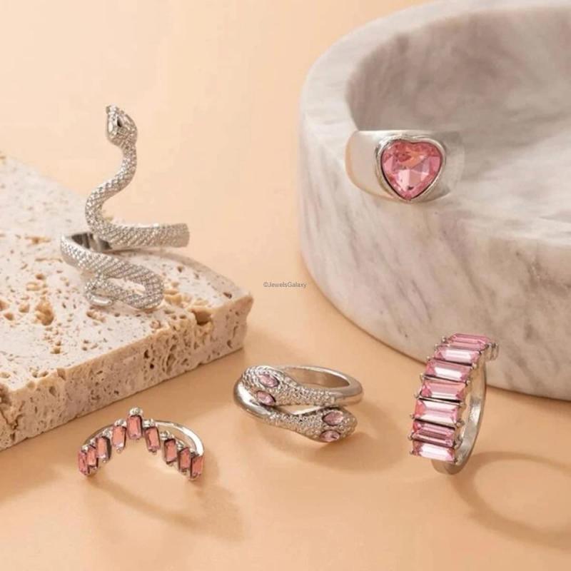 Elevate your style with this stunning set of 5 stackable rings featuring silver-plated snake-inspired designs with pink stone hearts. Perfect for adding a touch of elegance to any outfit.