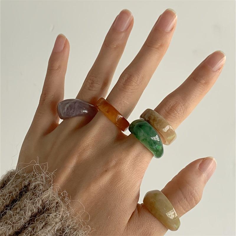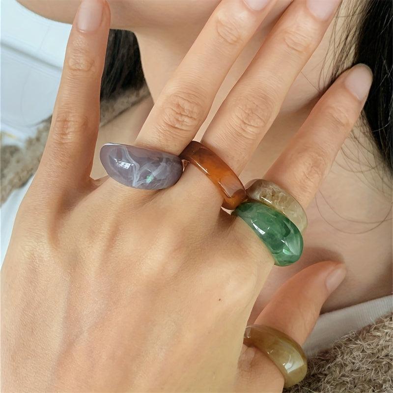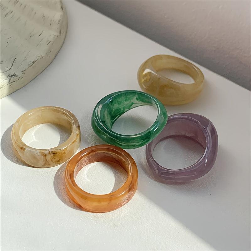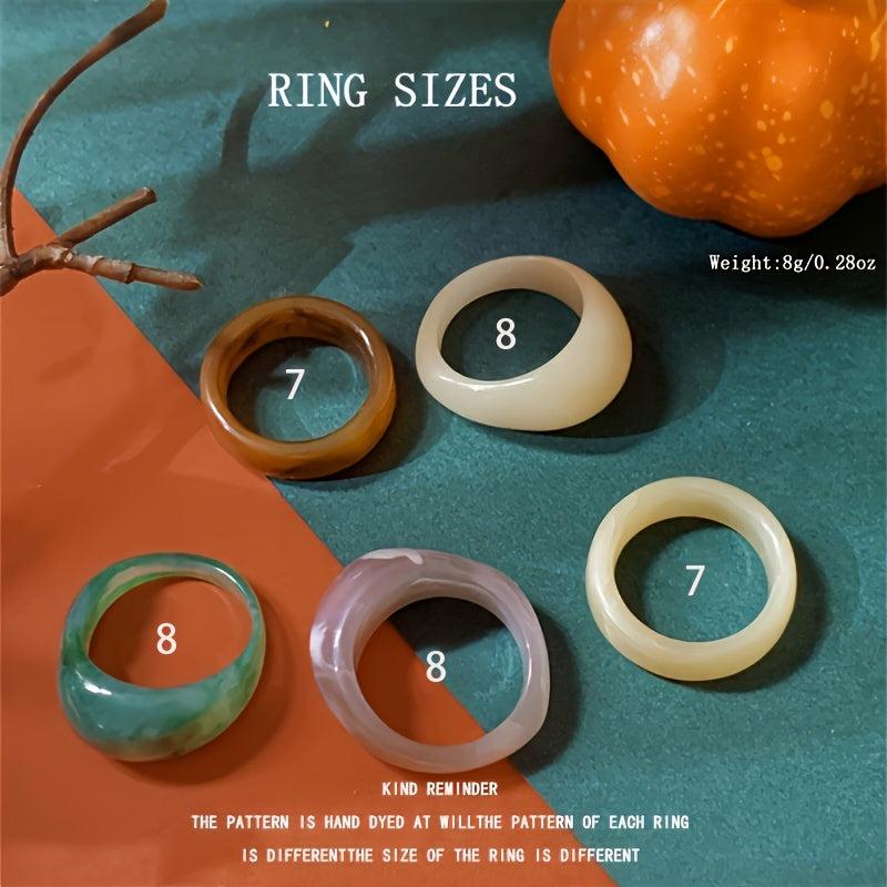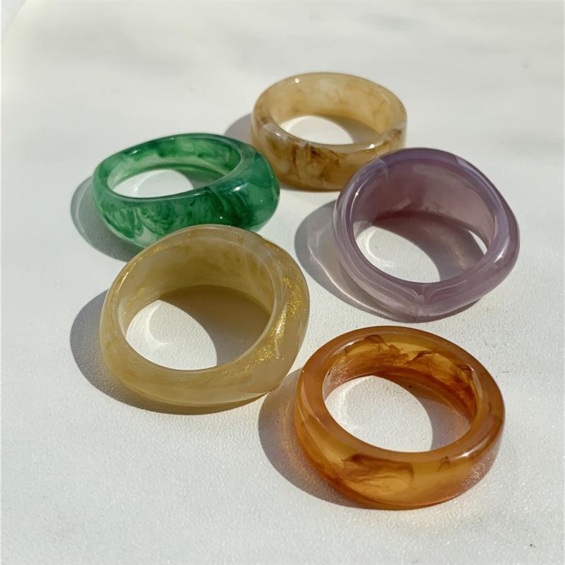 These unique handcrafted rings feature a vintage geometric colored resin design with golden foil inlay and gradient texture. The stackable rings come in assorted sizes, showcasing a marbling effect that adds a touch of elegance to your jewelry collection.