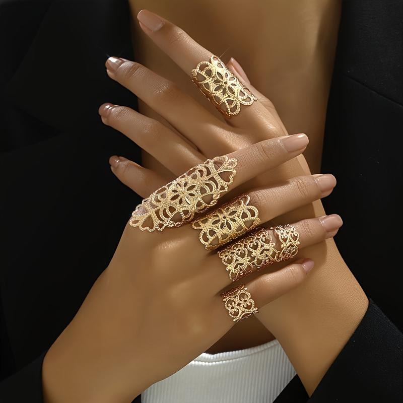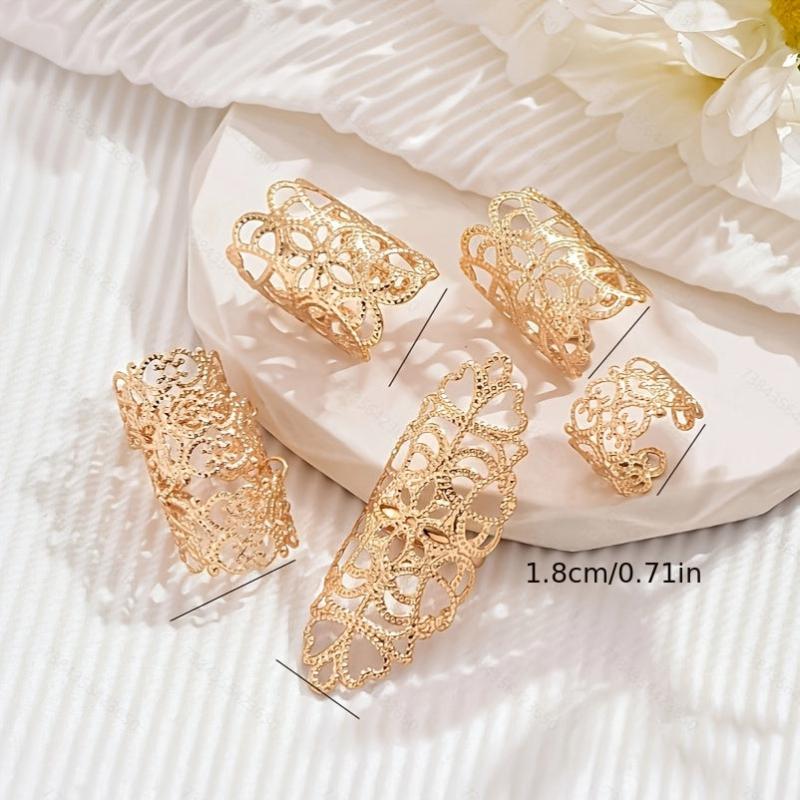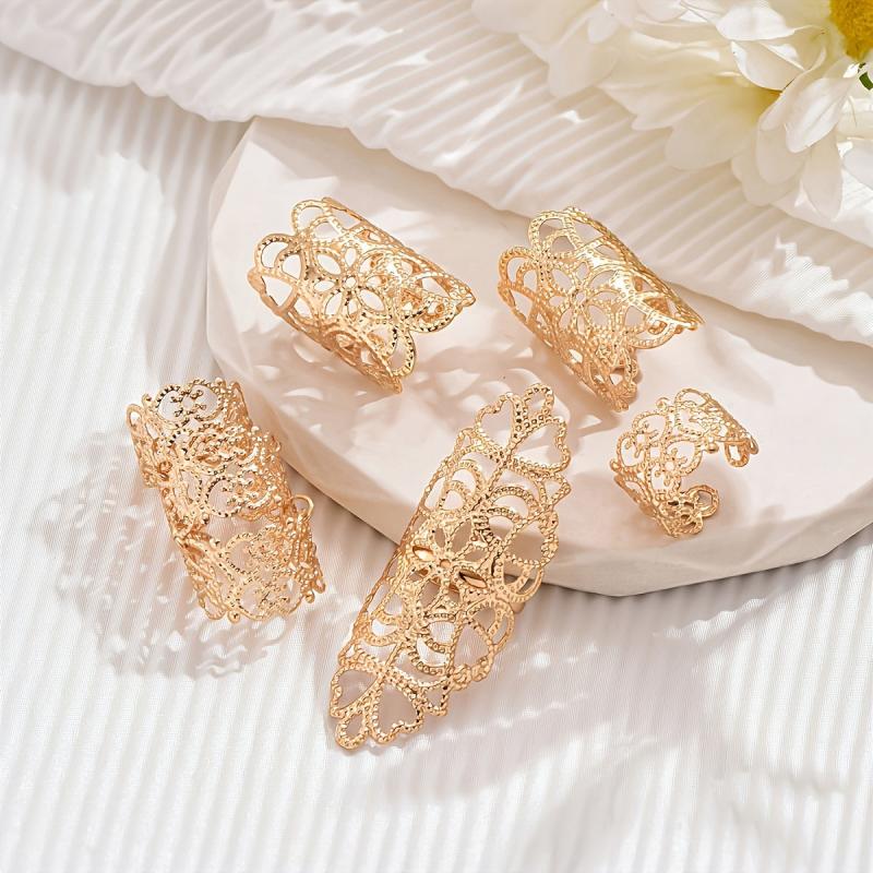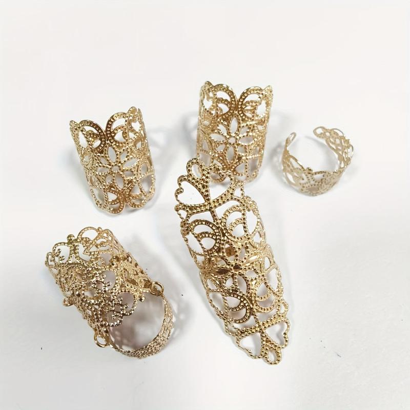 Elevate your style with this set of 5 Gothic hollow flower rings, perfect for both casual attire and special occasions. Made of iron, these vintage-inspired statement rings are adjustable to fit most sizes.