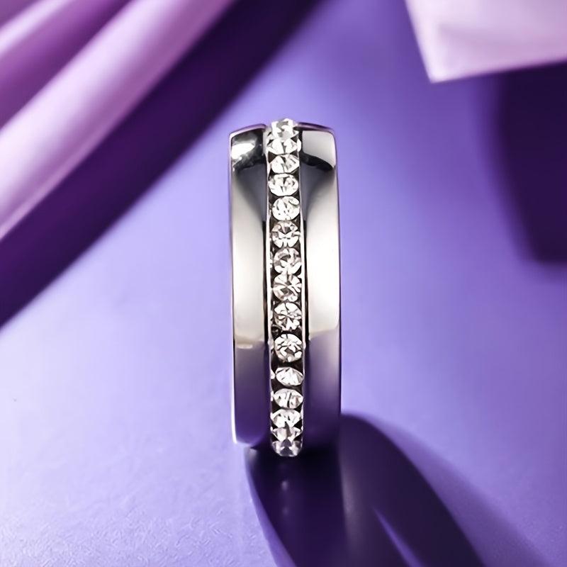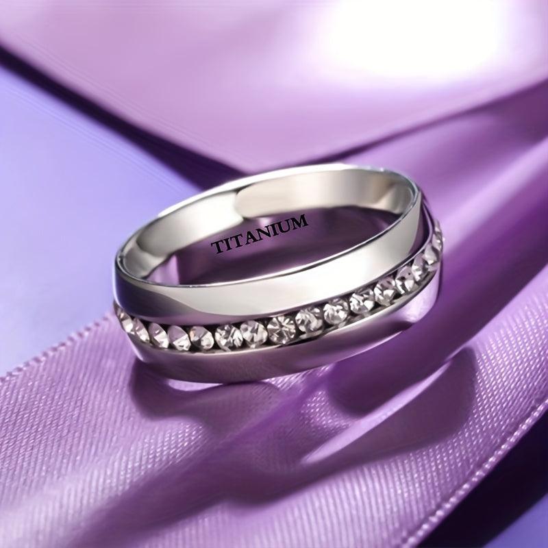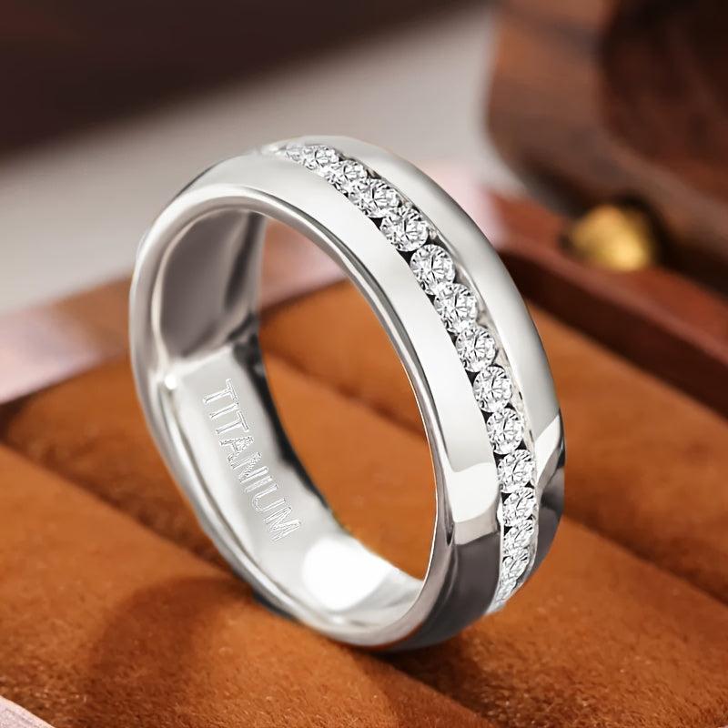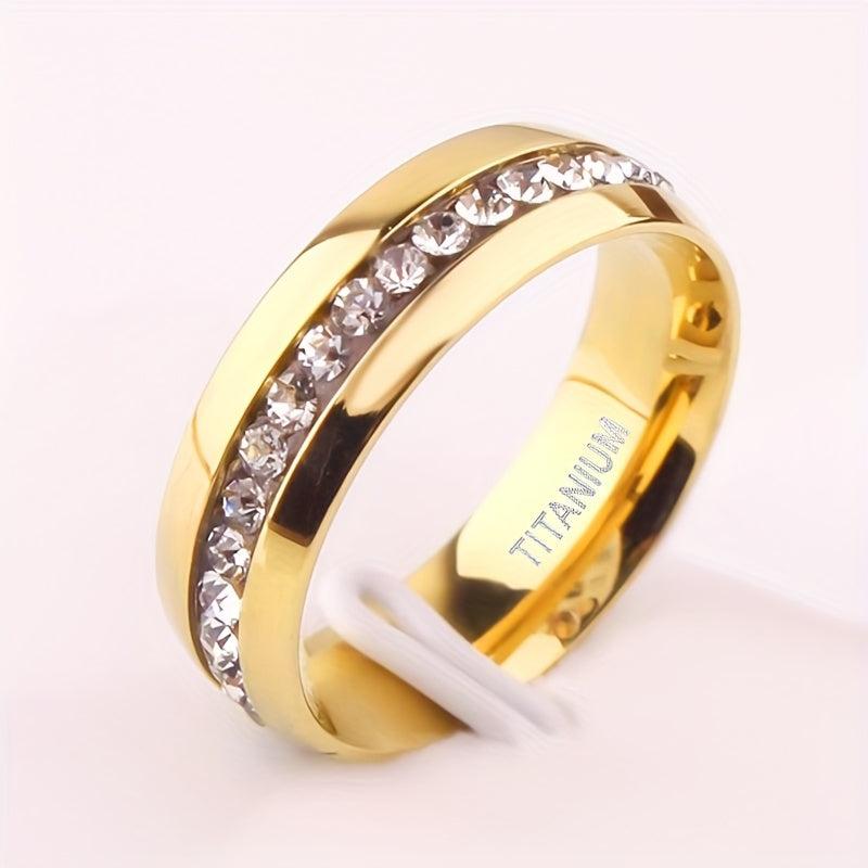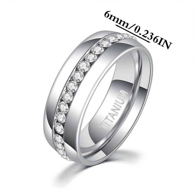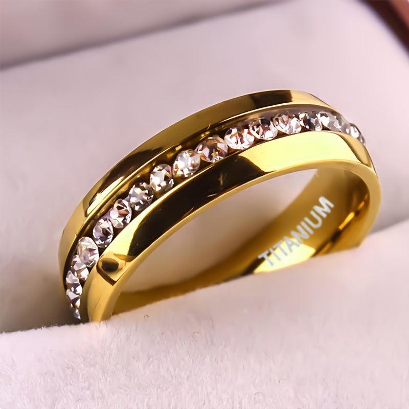 This 6mm titanium wedding band features sparkling cubic zirconia and durable 18K golden plating. Perfect for daily wear or special occasions throughout all seasons.