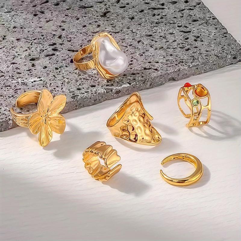 Elevate your style with this set of 6 vintage-inspired French Baroque rings featuring intricate floral designs and faux pearl accents. Perfect for daily wear or special occasions.