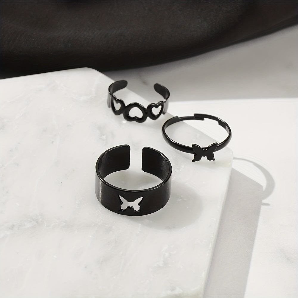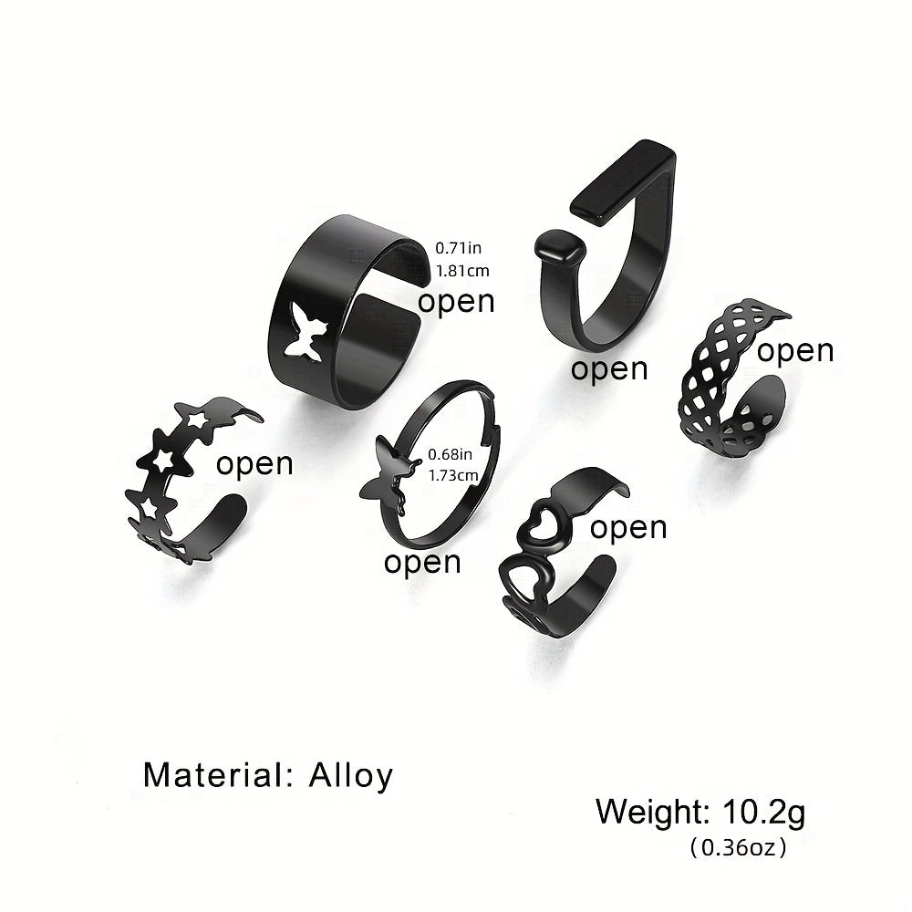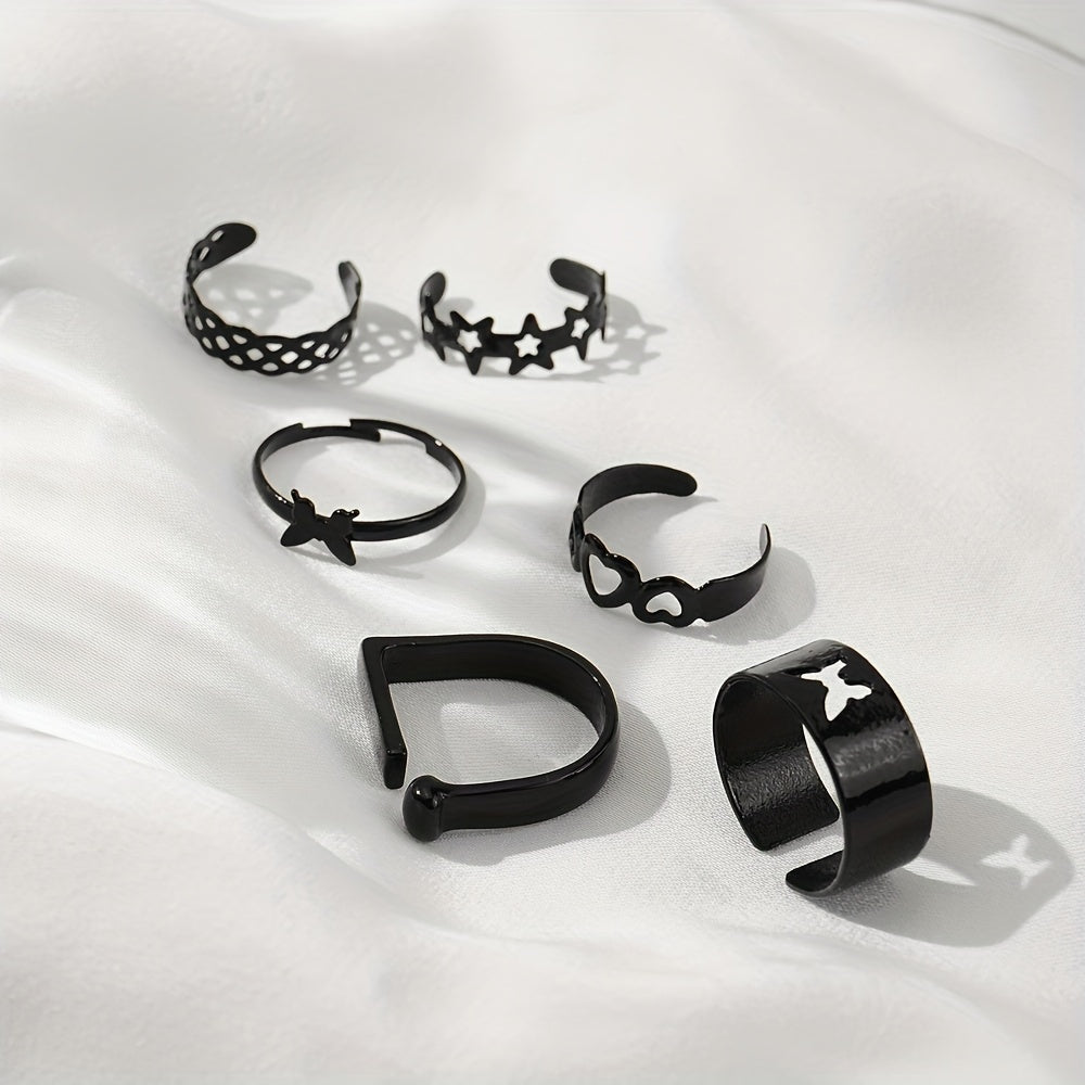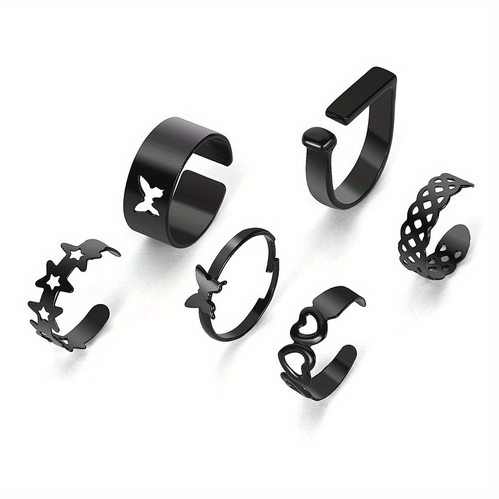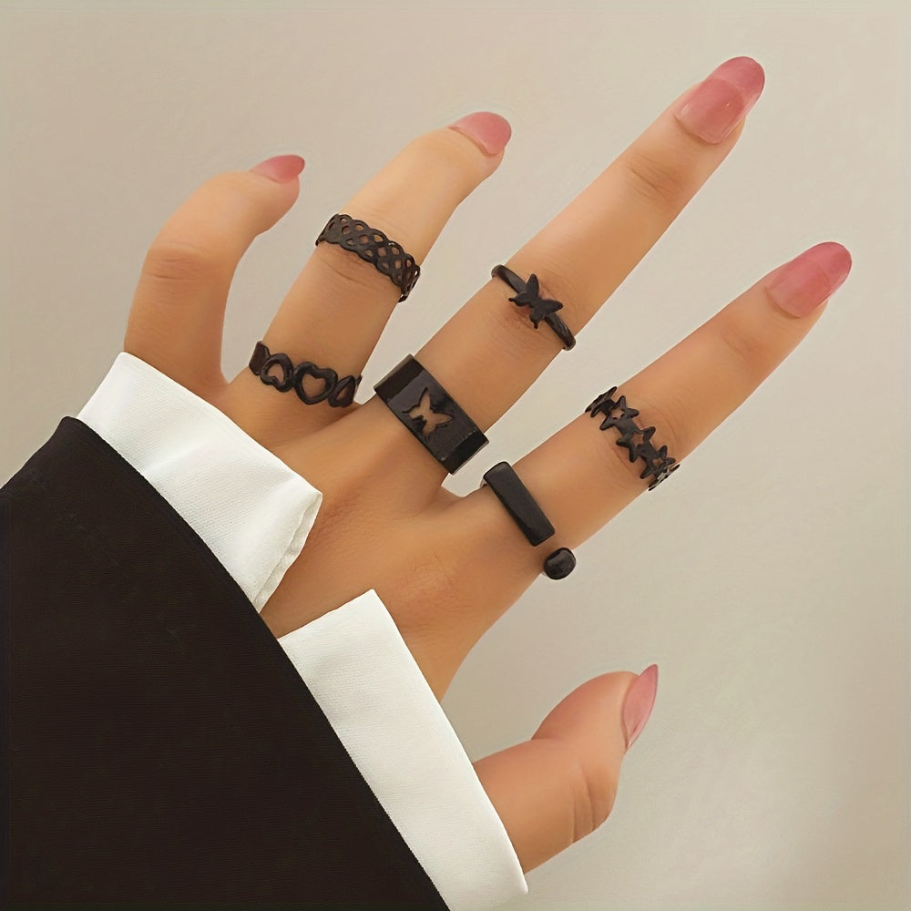 Add a touch of edgy style to your daily outfits or party looks with this set of 6 punk-style stacking rings. Featuring dark heart and butterfly designs, these rings are perfect for mixing and matching to create your own unique look.