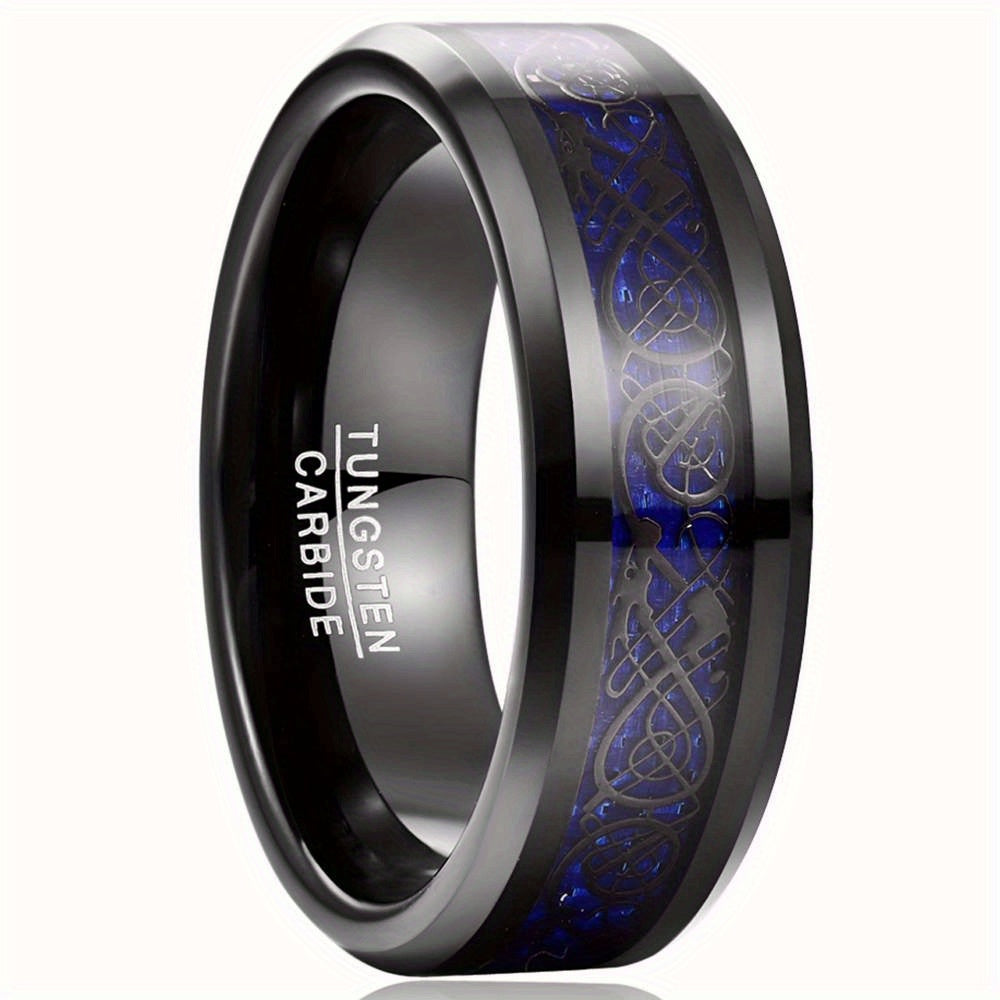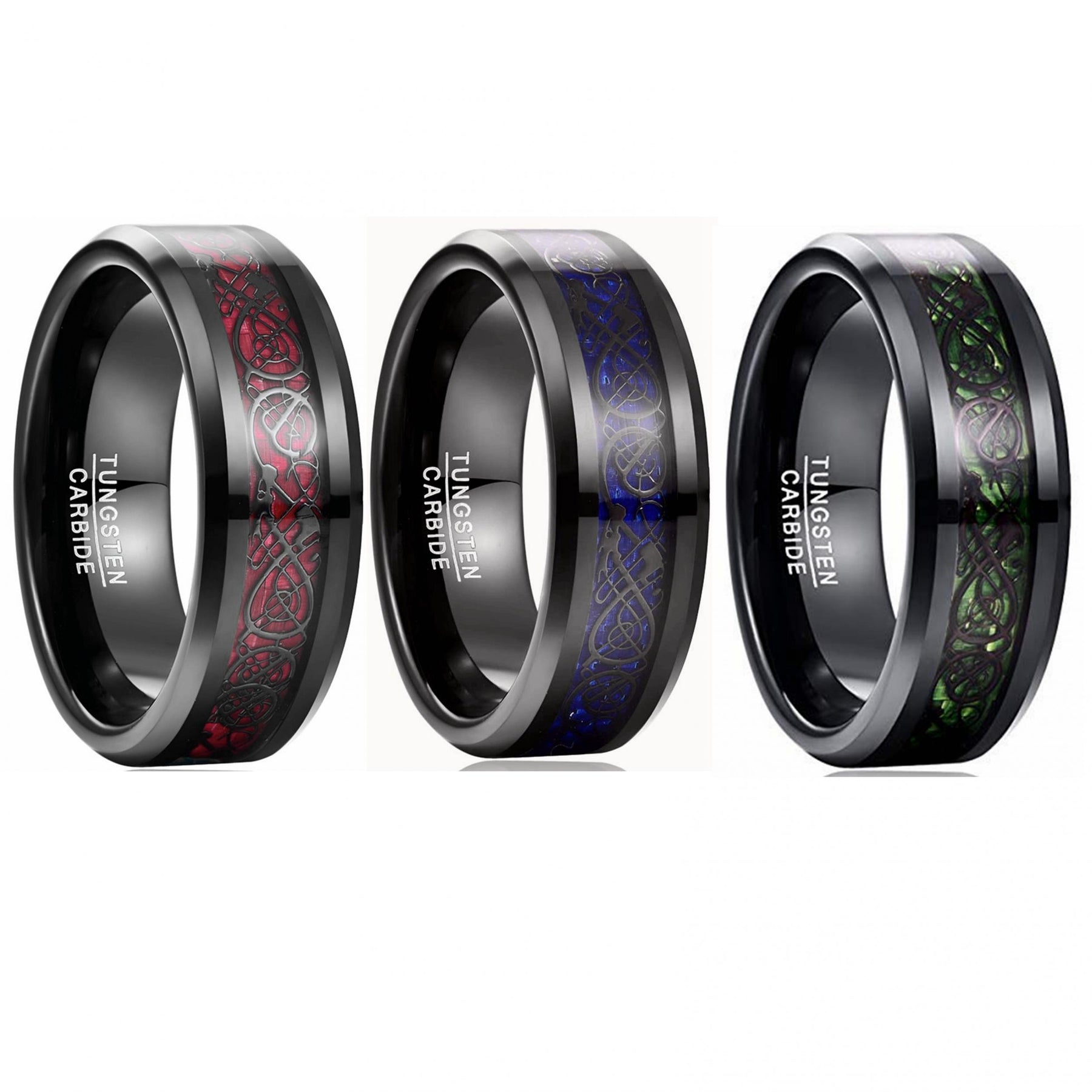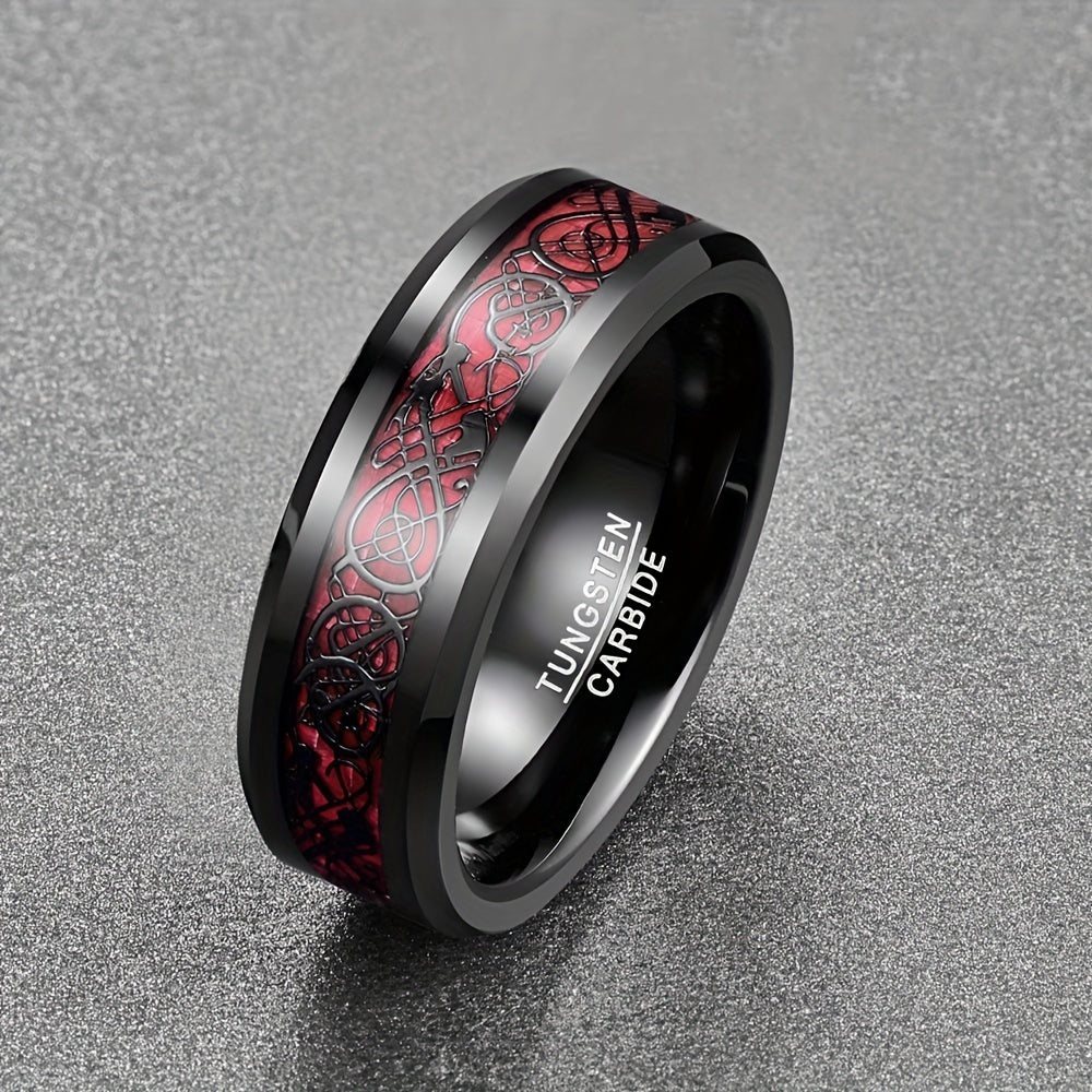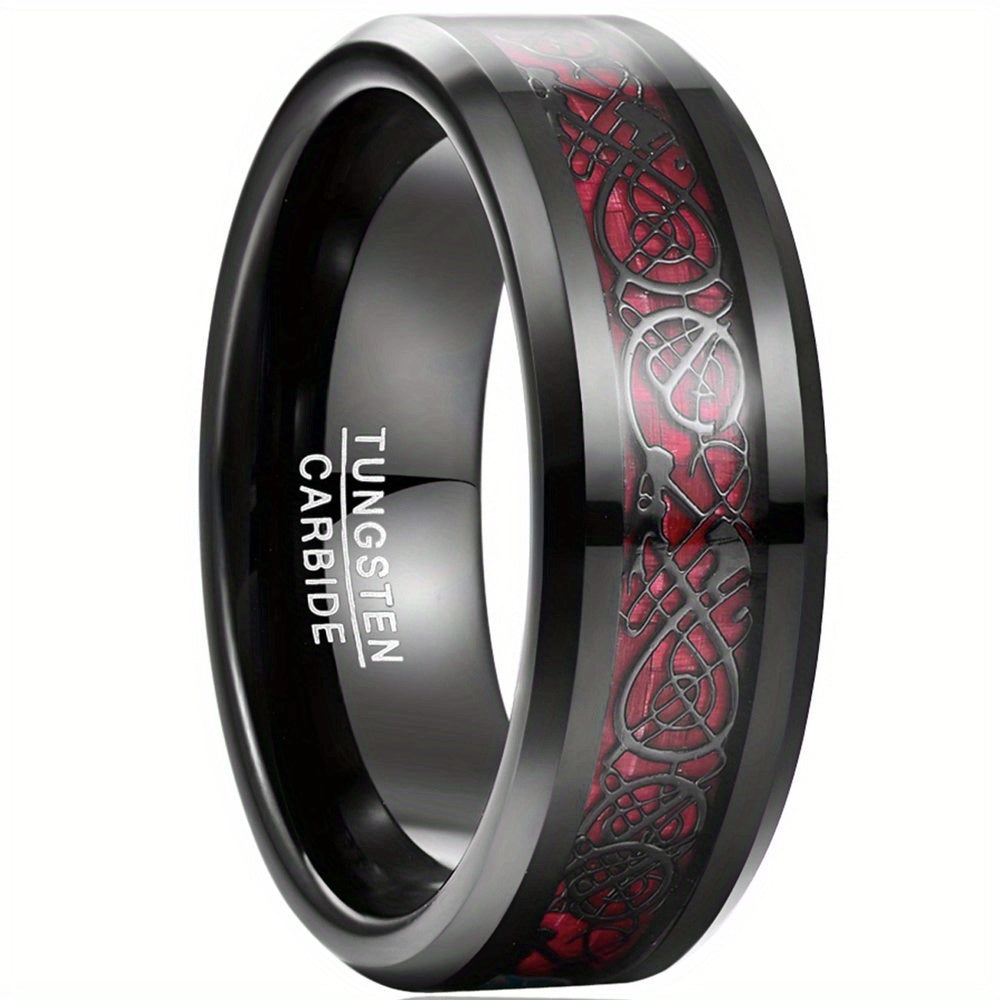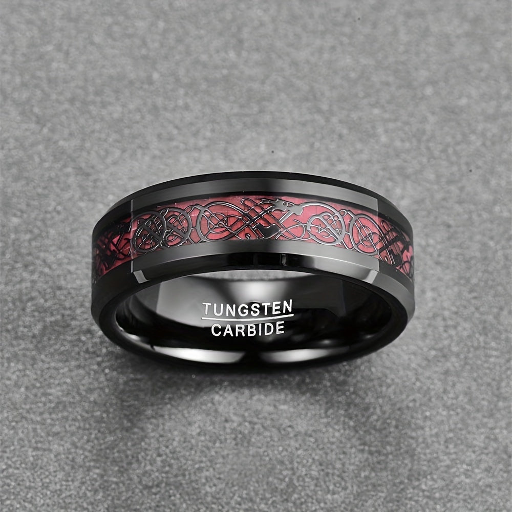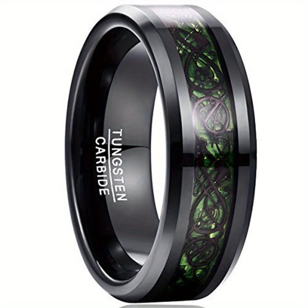 This men's tungsten ring features an inlaid carbon fibre with a choice of red or green dragon pattern, making it a unique and stylish accessory. Available in sizes 7-14.