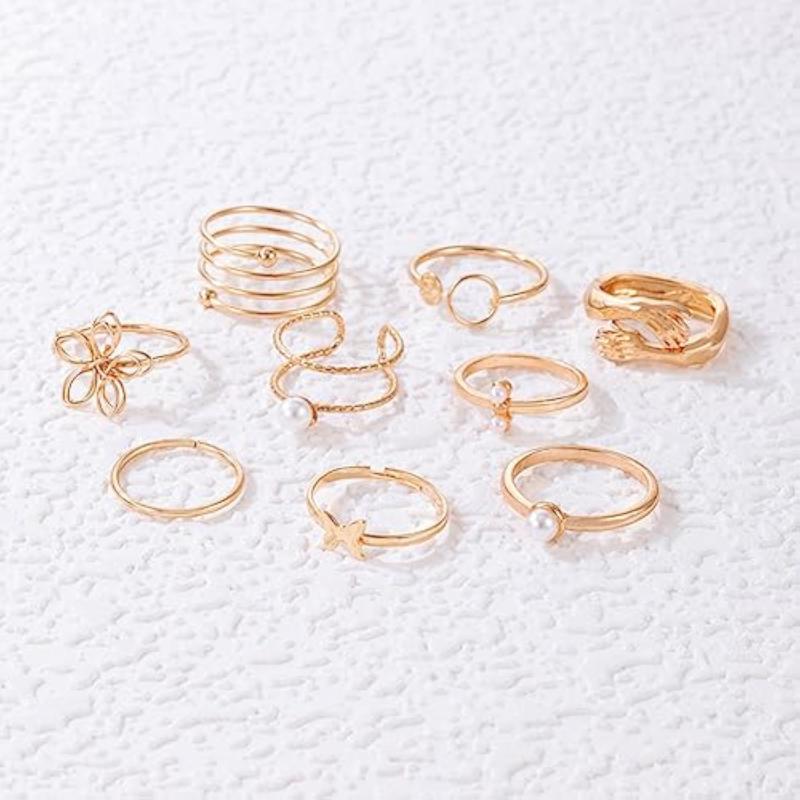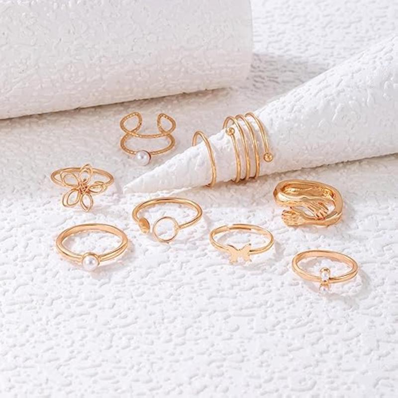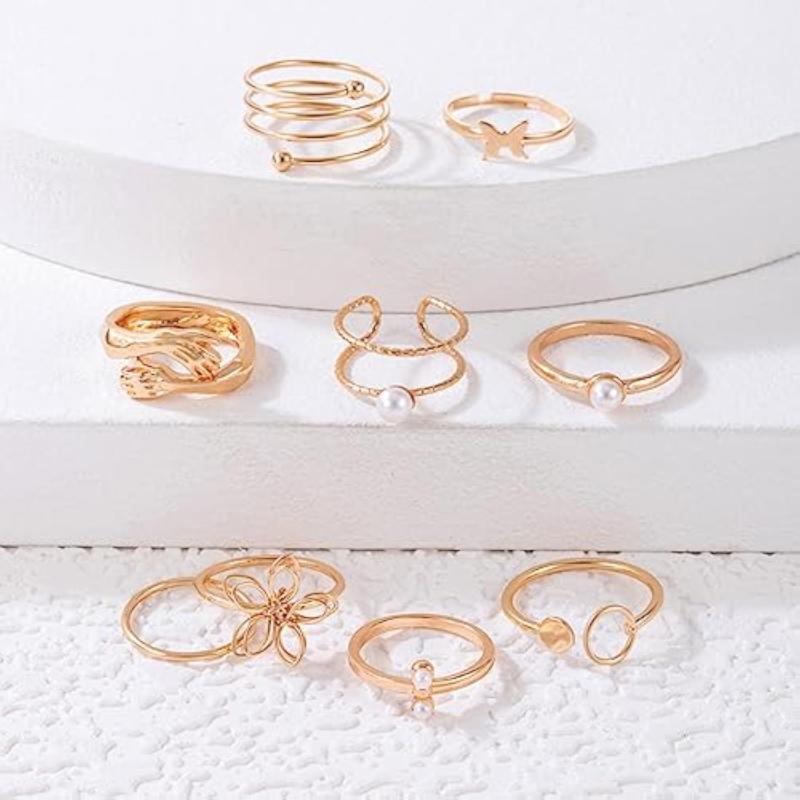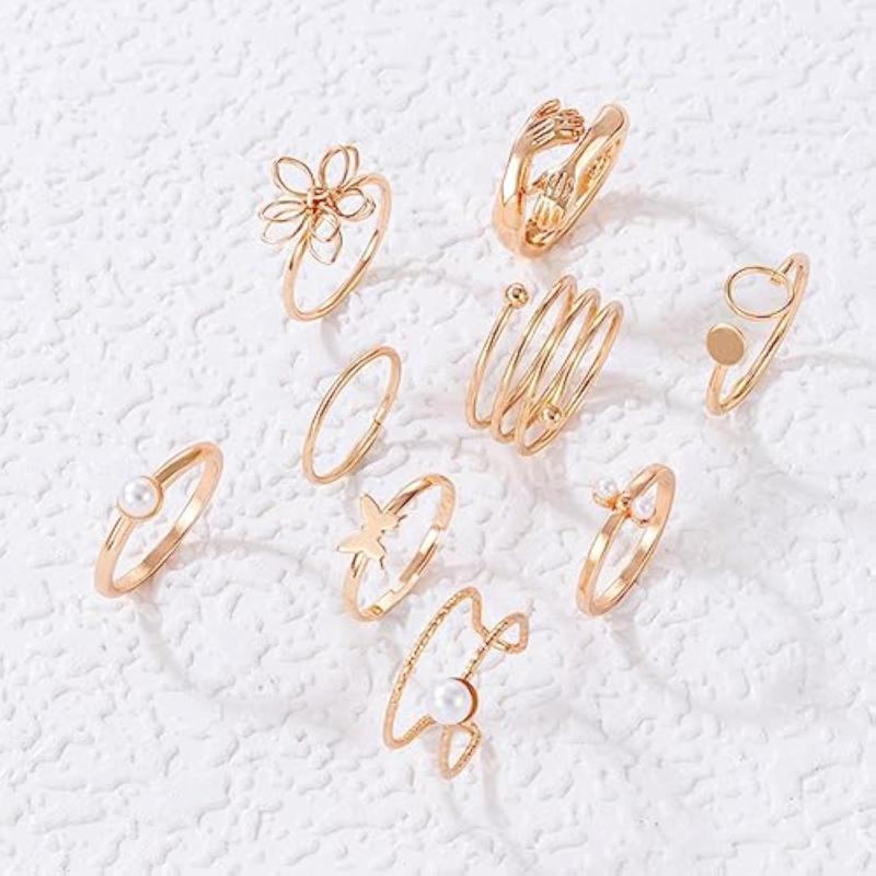Elevate your style with this set of 9 stylish rings for women. Crafted with high-quality materials, these rings are perfect for adding a touch of glamour to any outfit.