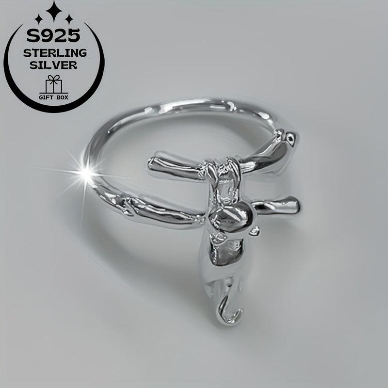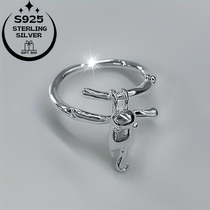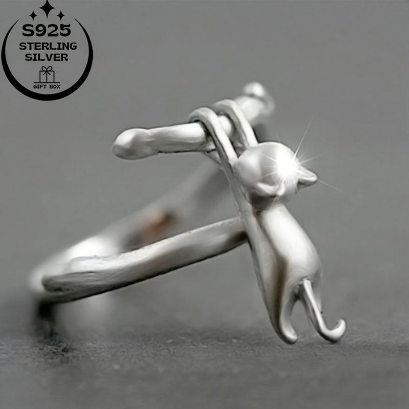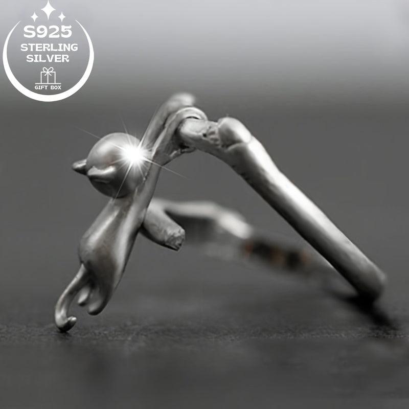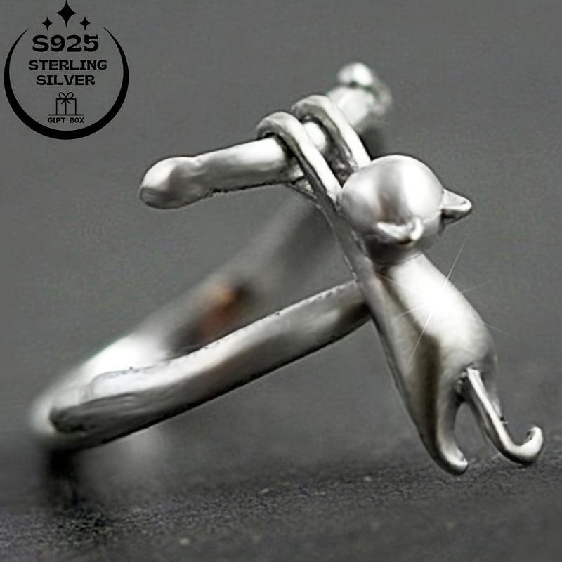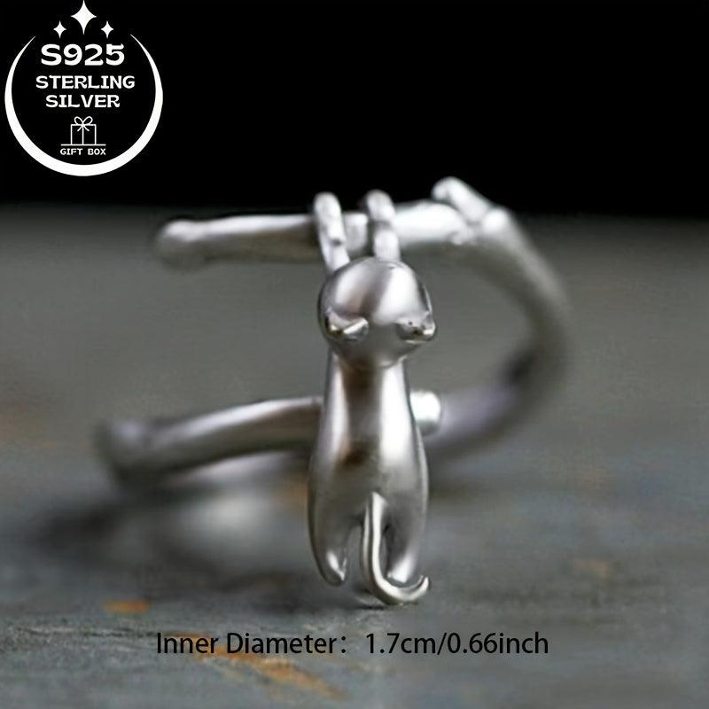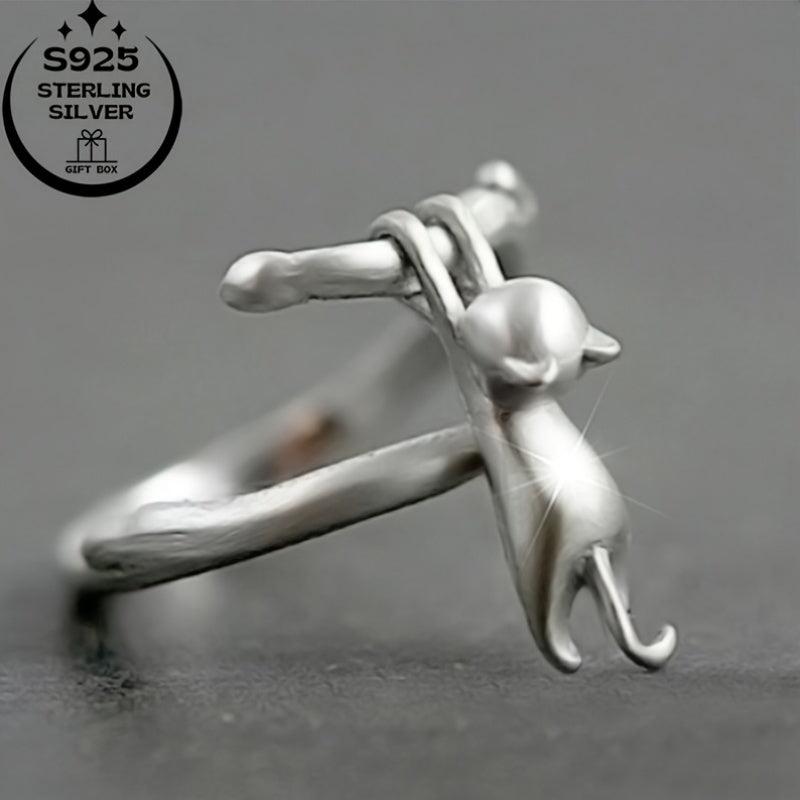 Adorable 925 sterling silver cat ring featuring a lazy cat climbing high. Perfect gift for cat lovers, suitable for daily wear, parties, commute, summer beach, and vacation.
