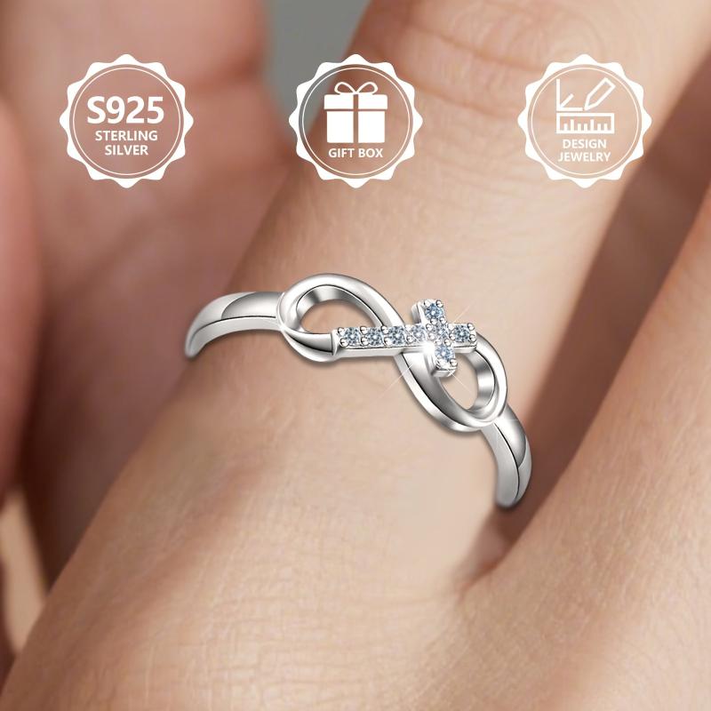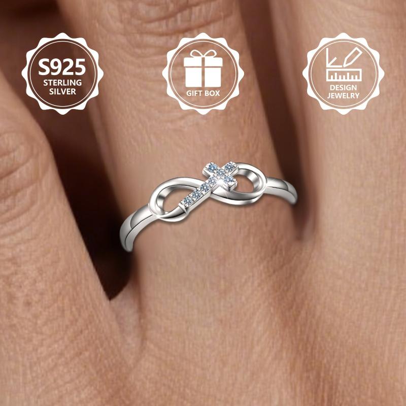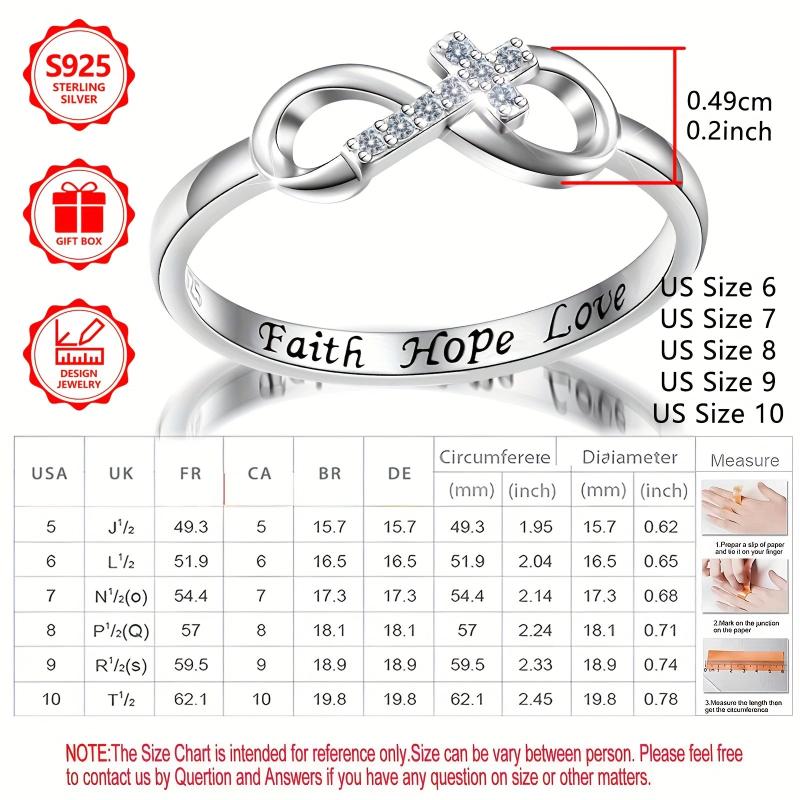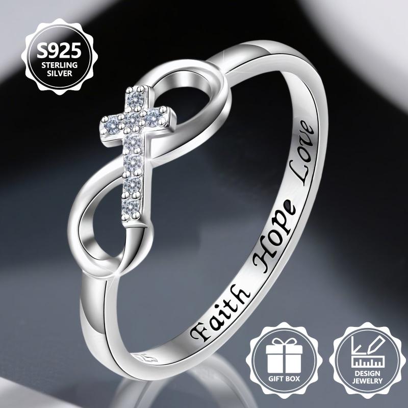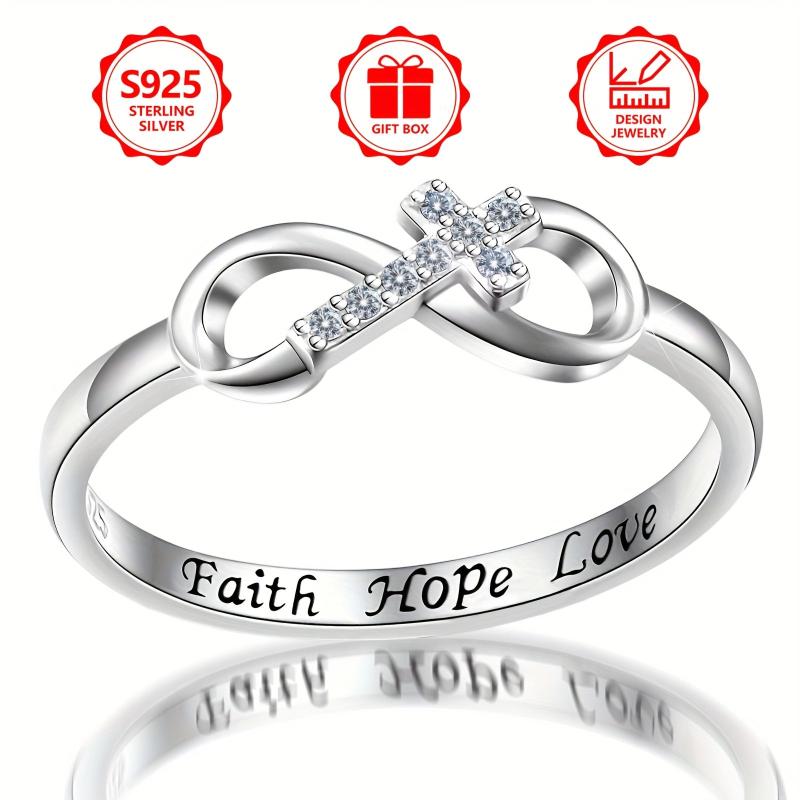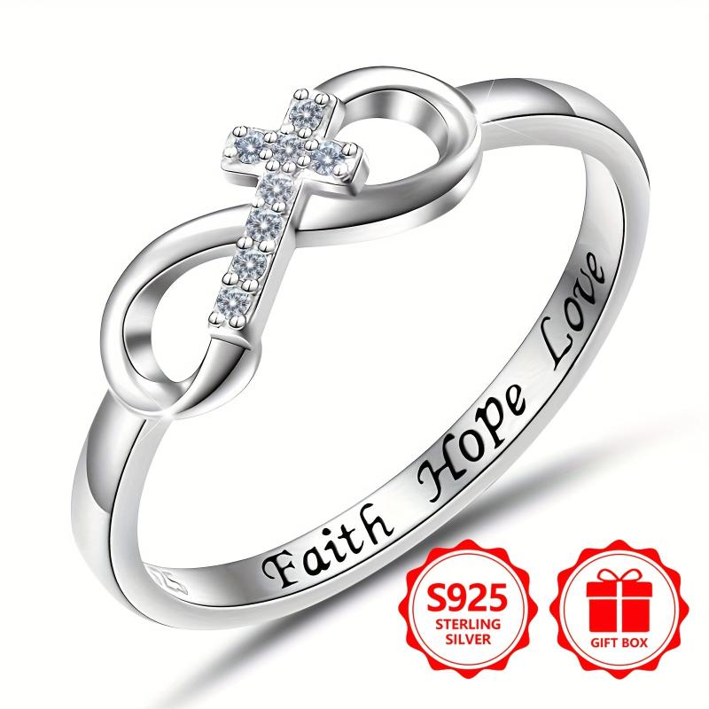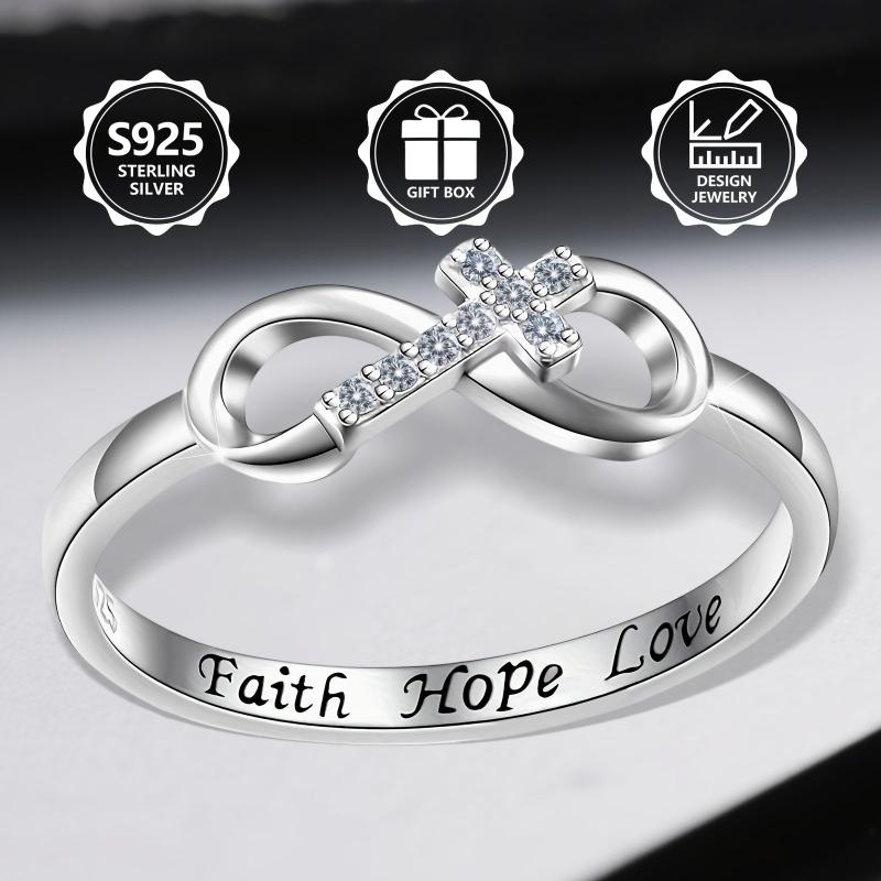 This 925 sterling silver ring features an inspirational design of a cross and infinity symbol. Engraved with Faith, Hope, Love, it makes a perfect gift for your lover, wife, relatives, and friends to show your independence.