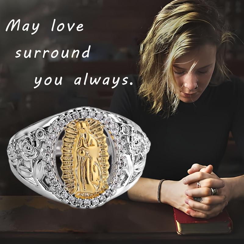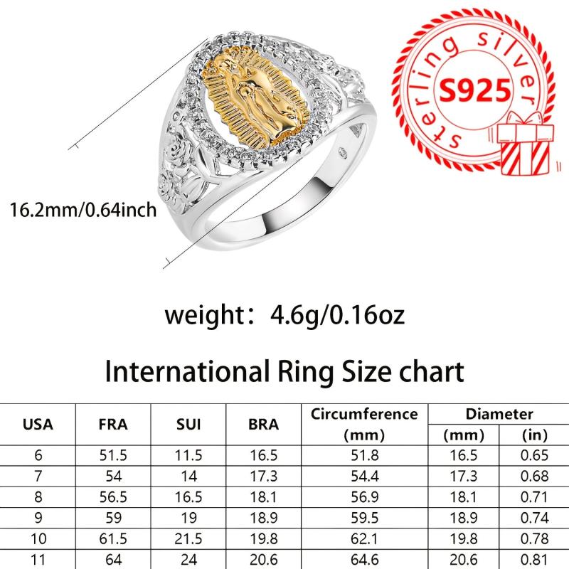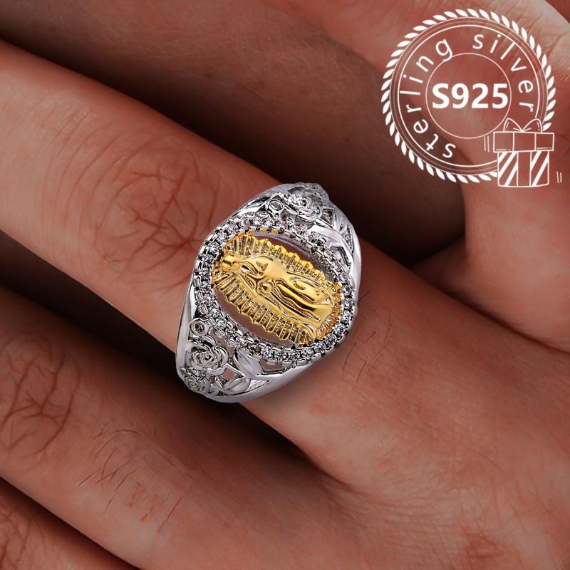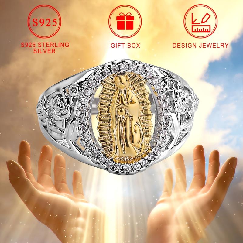 This stunning 925 silver ring features a Sacred Mother design with synthetic cubic zirconia accents. The double-tone plating adds a touch of elegance, making it perfect for daily wear or special occasions.