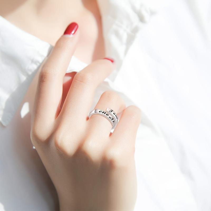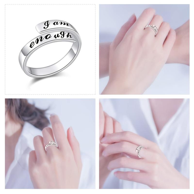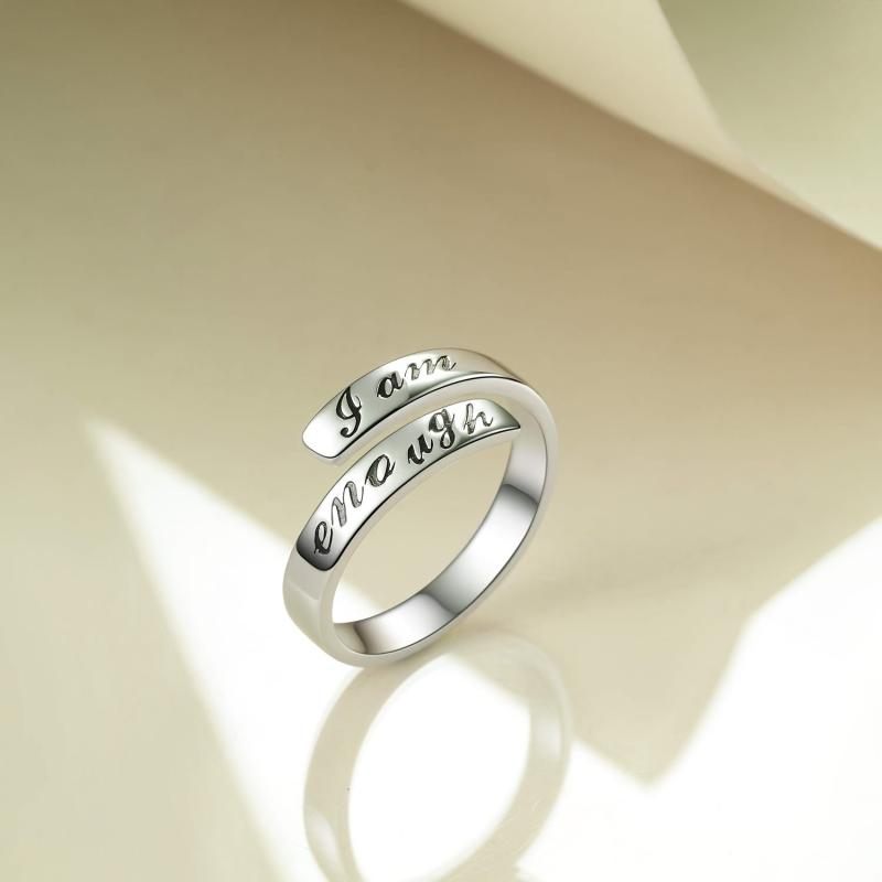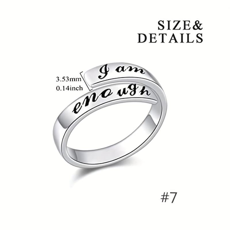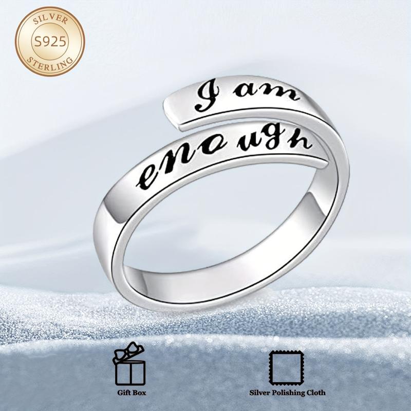 Elegant 925 sterling silver ring with 'I Am Enough' engraved message. This adjustable ring is perfect for women seeking a reminder of self-worth and empowerment.