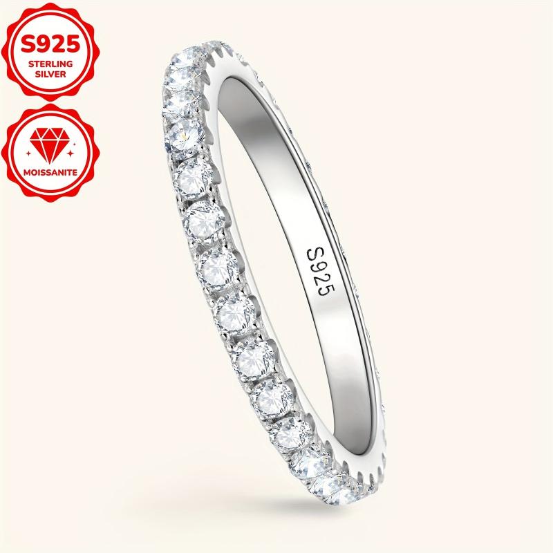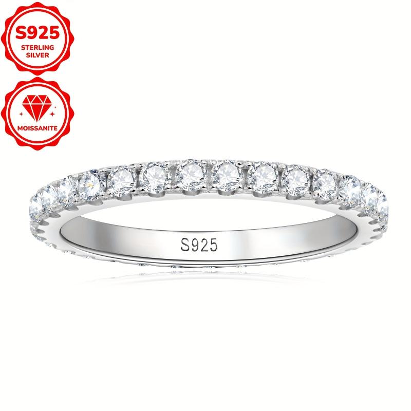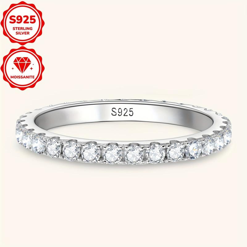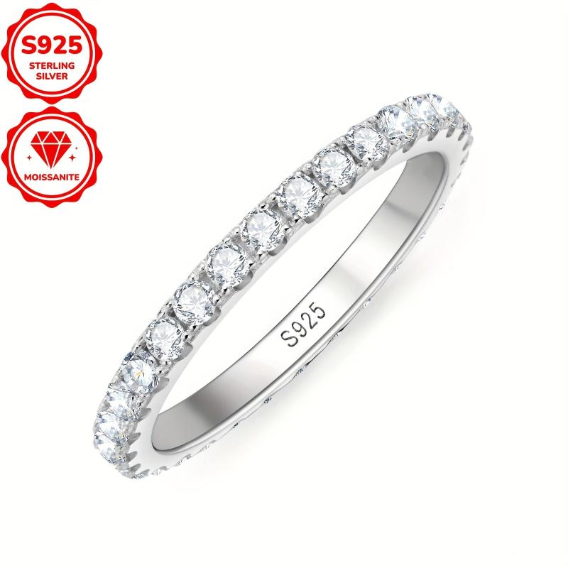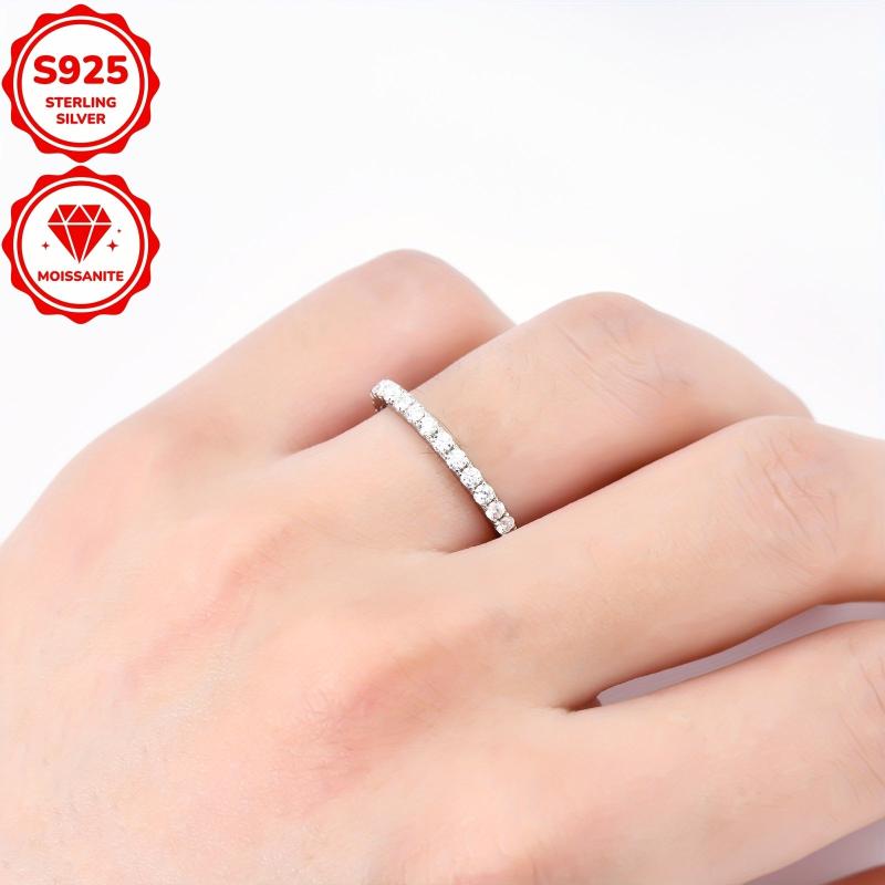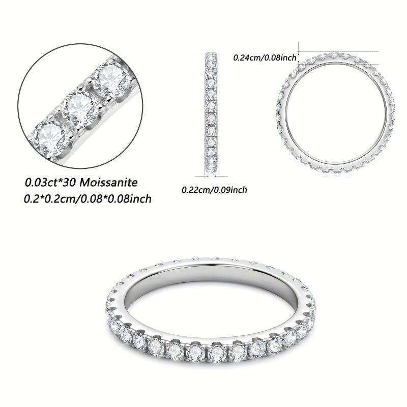 This stackable band ring is crafted from 925 silver and features 30 round cut 2mm moissanite stones totaling 0.03ct. Available in sizes 4 to 10.